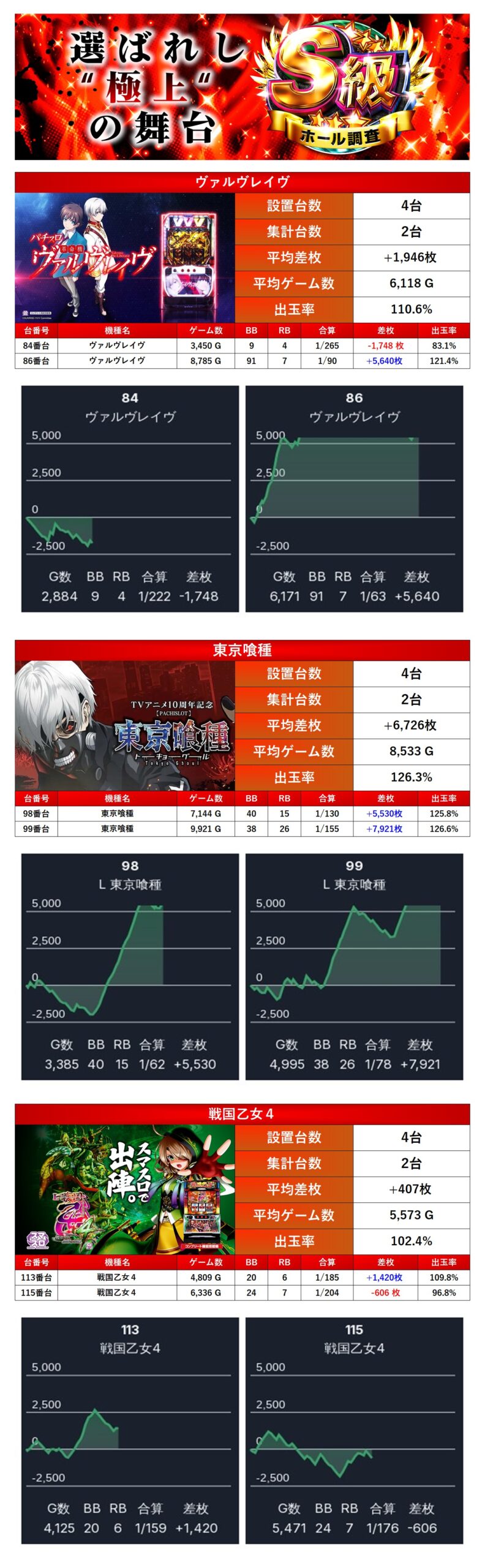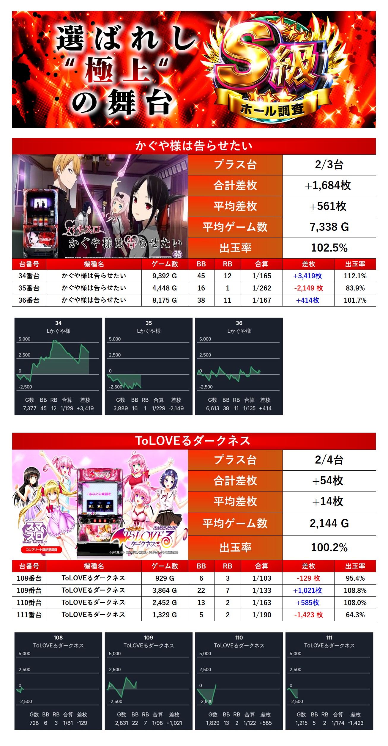 「かぐや様」「ToLOVEる」の全台系はやや控えめな結果に留まったものの、「ヴヴヴ」や「東京喰種」など人気機種を含むニブイチの盛り上がりがホール全体を支えた印象だ。