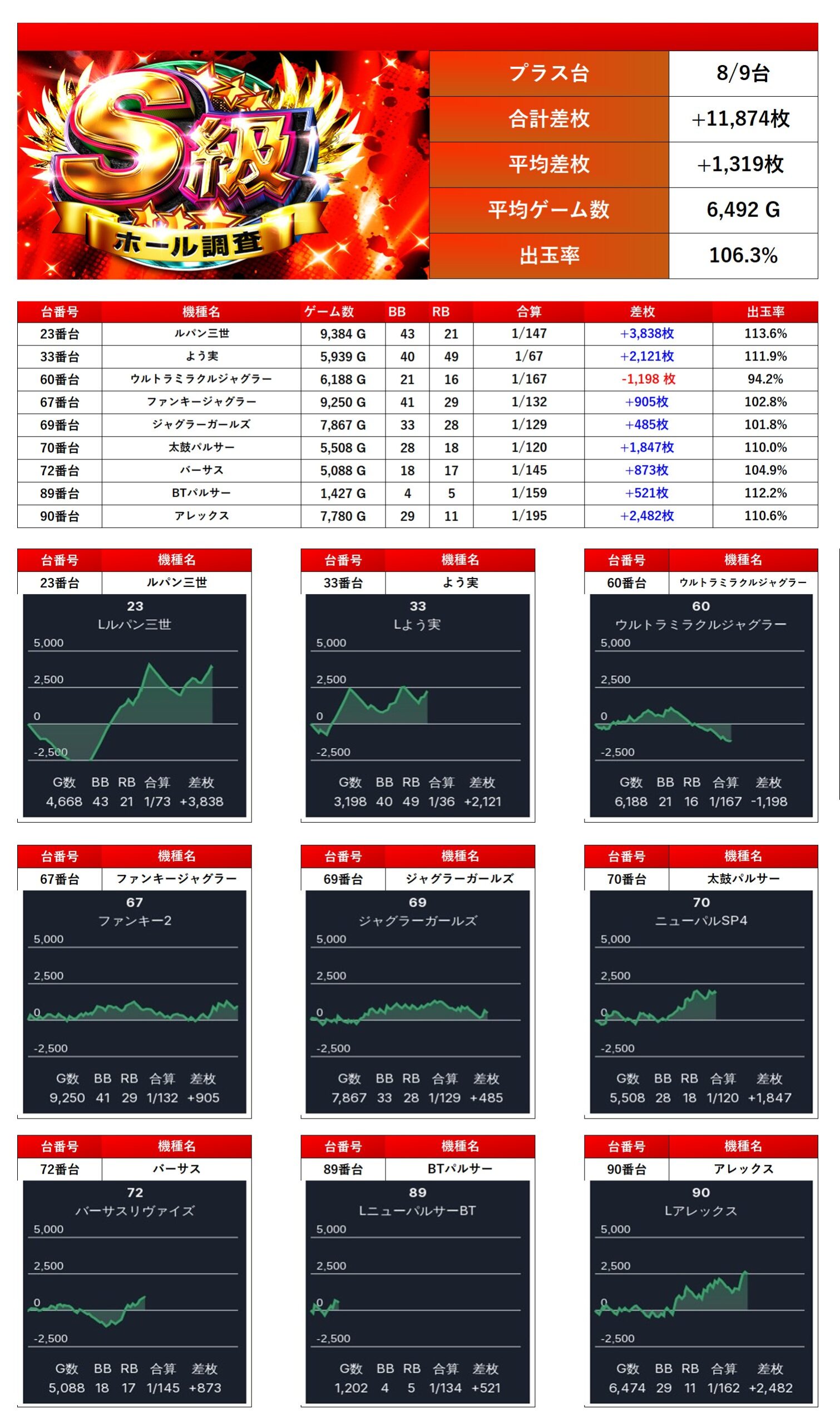 計9台をpick upし、平均差枚は+1,319枚、平均出率106.3%。