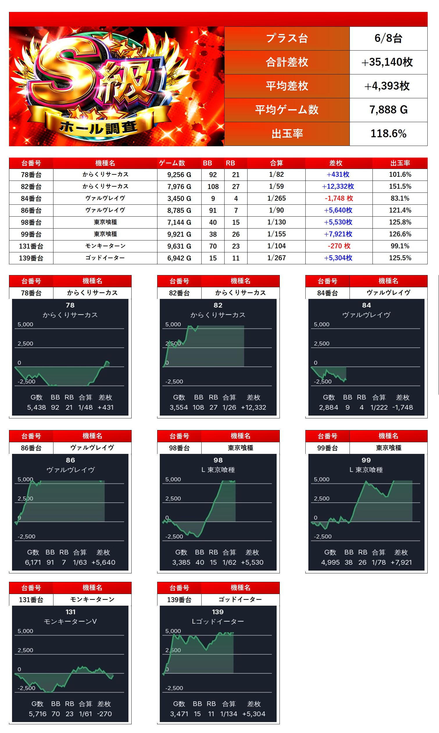 合計8台をpick upし、平均差枚は+4,393枚、平均出率118.6%という圧巻の数値を記録。