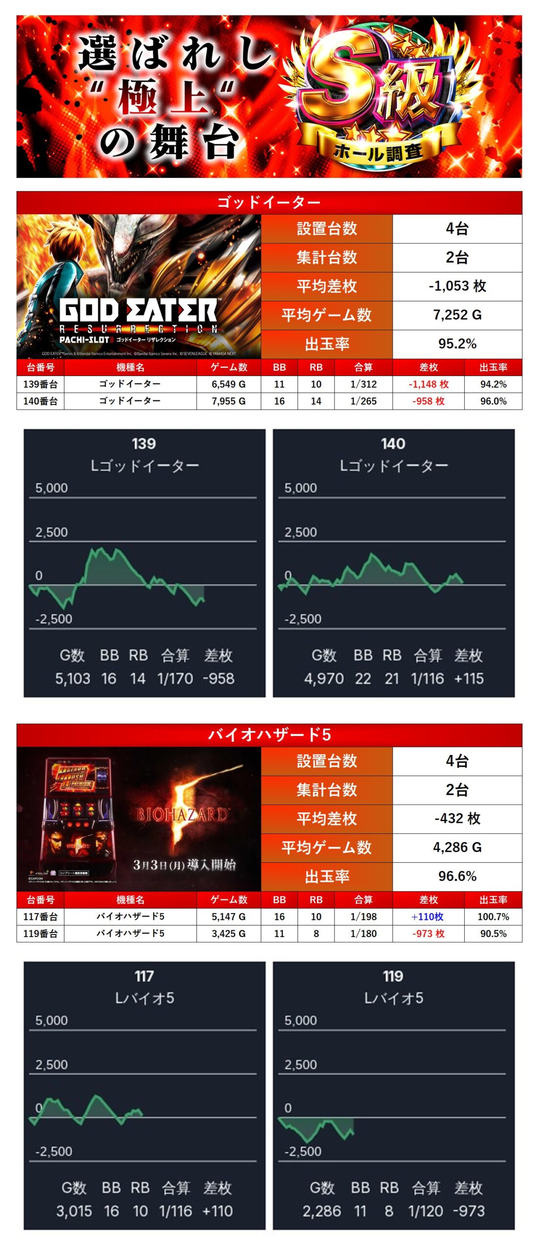 しかし平均差枚-742枚、平均出率95.7%と振るわず、やや苦しい内容に。