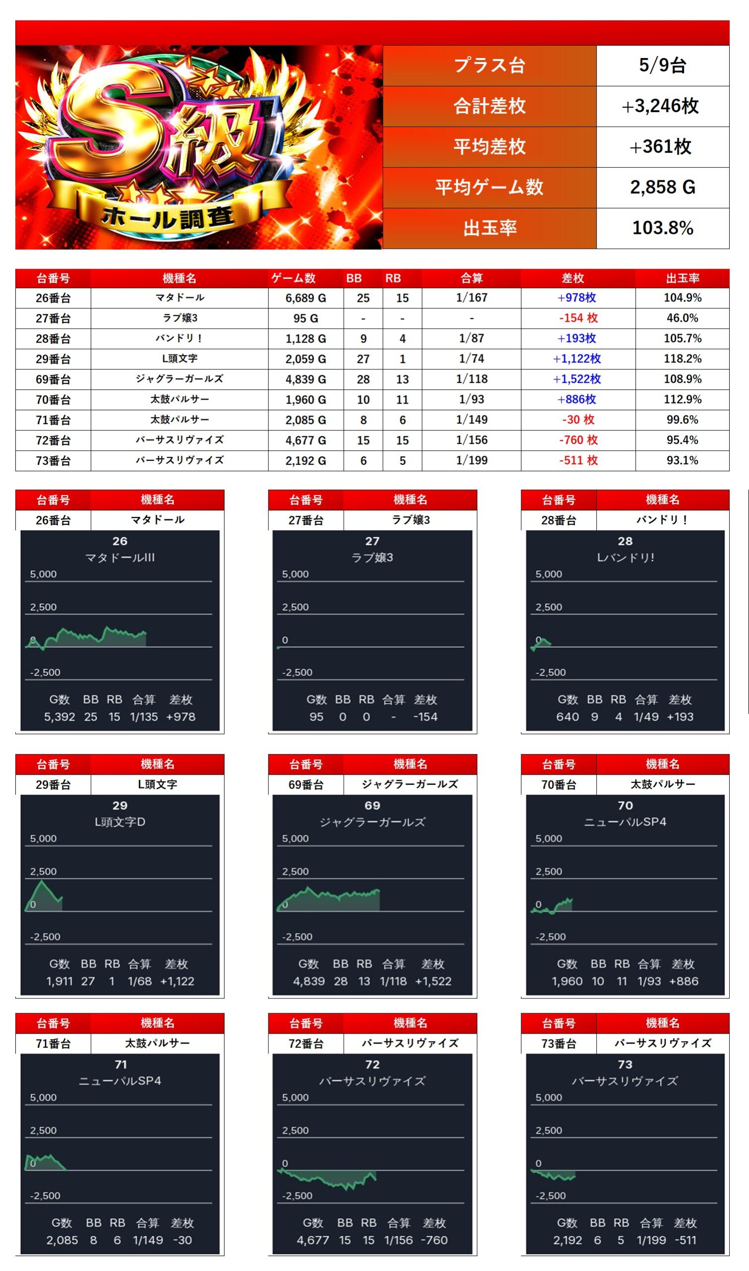 平均差枚+361枚、平均出率103.8%と控えめな数値ながら、幅広い機種に仕掛けを散らす意識は感じられた。