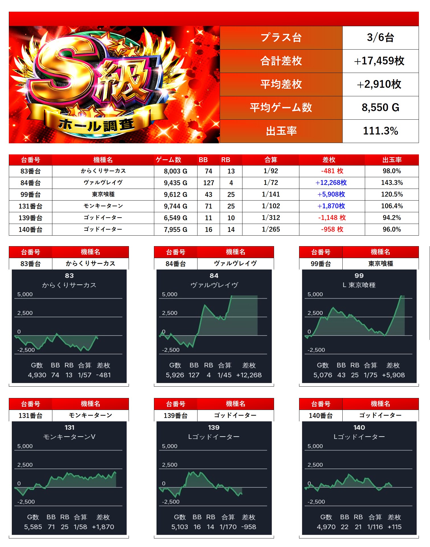 平均差枚は+2,910枚、平均出率111.3%と、一部はしっかり結果を残しており存在感を示した。