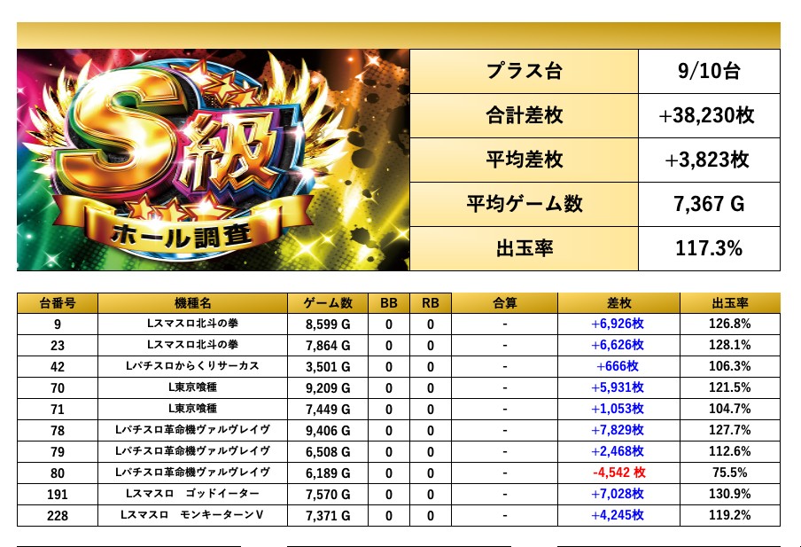「ヴヴヴ」「からくり」「東京喰種」「モンキーターン」「ゴッドイーター」「北斗の拳」といった主力機種から10台をピックアップ。「ヴヴヴ」はニブイチの仕掛けも確認され、平均差枚+3,823枚/出率117.3%と安定感ある結果を残した。