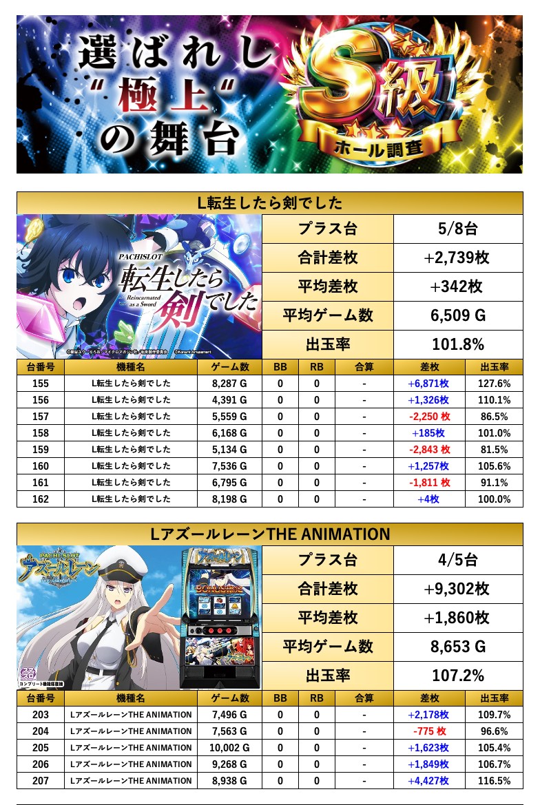 「転生したら剣でした」や「アズールレーン」の2機種13台がpickupされ平均差枚+926枚/出率104.3%だった。