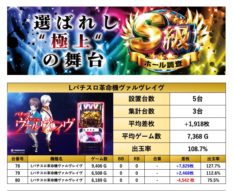 メイン機種の「ヴヴヴ」からはニブイチ仕掛けが見られ、平均差枚+1,918枚/出率108.7%と抜群のインパクトを放った。爆発力の高さが際立ち、ユーザーの注目を集めた。