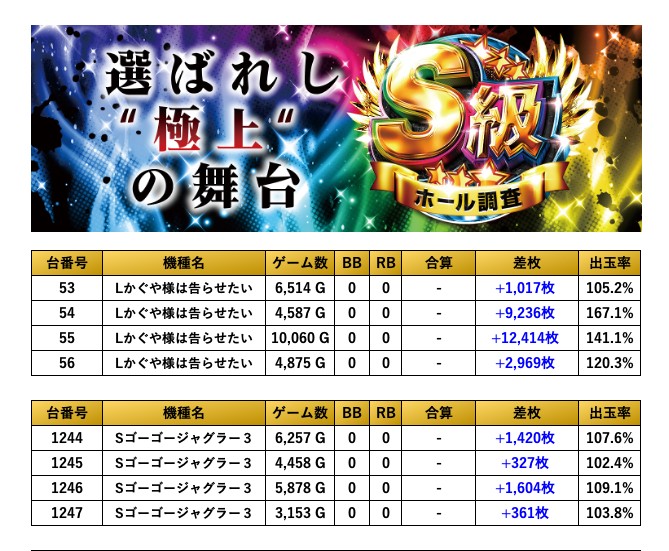 「かぐや様は告らせたい」や「ゴージャグ」から4台並びを計2箇所8台の平均差枚+3,669枚/出率121.4%をマーク。並びらしい視覚的な盛り上がりを演出した。
