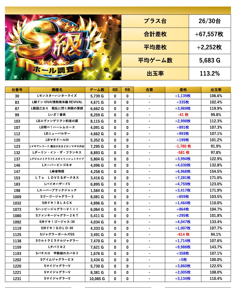 計30台がpickupされ、平均差枚+2,252枚/出率113.2%と高水準の数値を記録した。