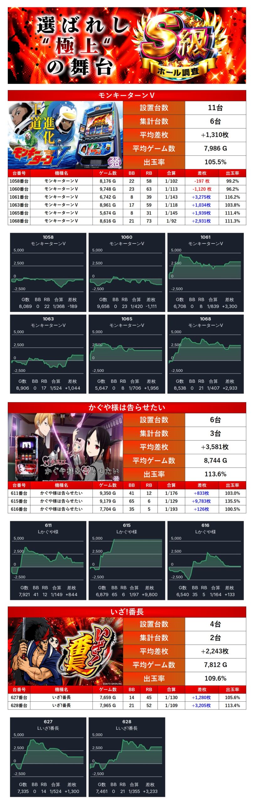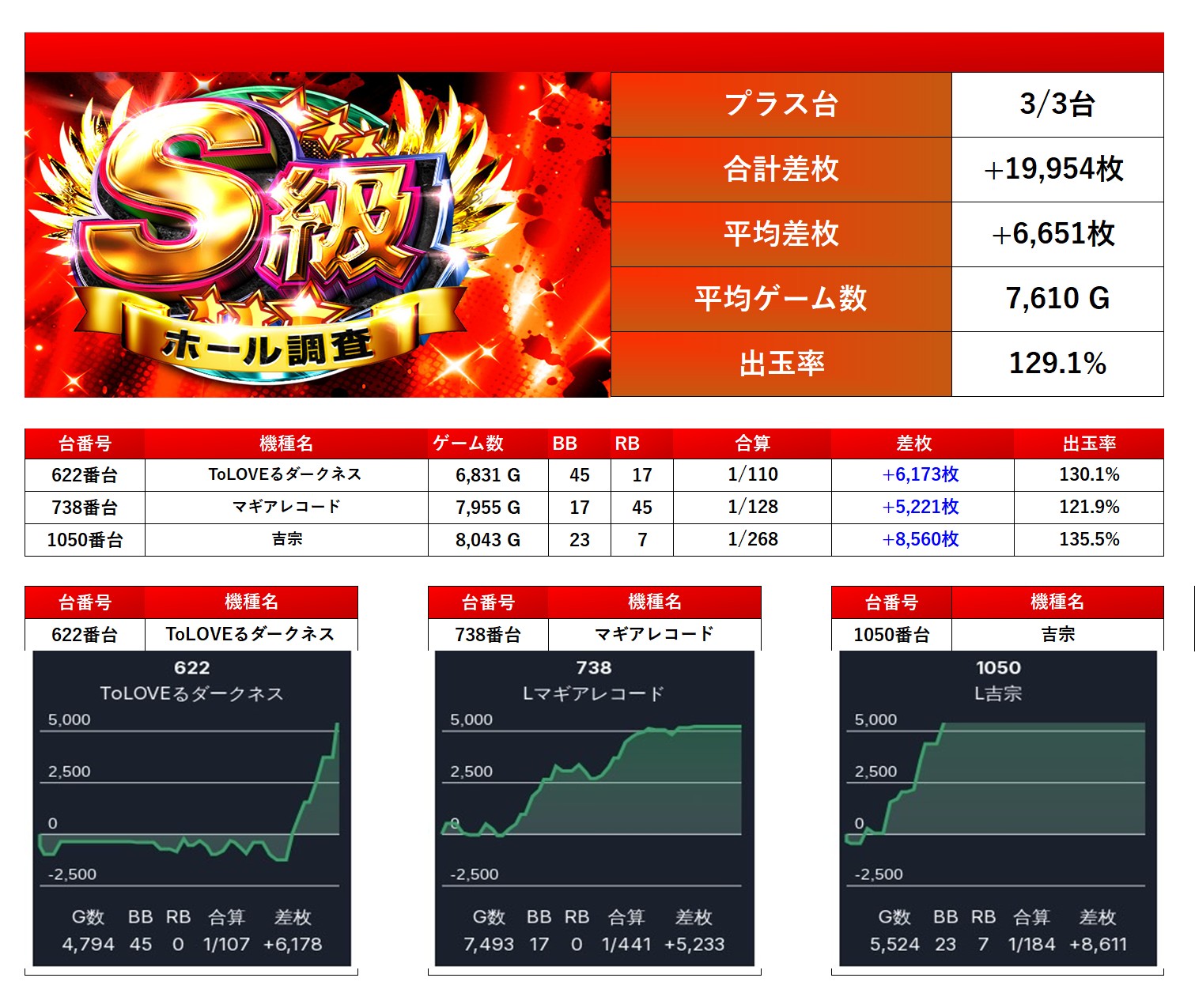 今回のグランドホール港南店のS級赤(三ツ星)調査は、まさに高評価にふさわしい内容となった。メイン機種の圧倒的な出玉に加え、全台系やニブイチ、2台設置以下の機種まで幅広い仕掛けが確認でき、来店ユーザーの期待に十分応える形となった。特に単品での6,000枚超えの結果はインパクト抜群で、次回以降も狙い台探しの重要なヒントになるだろう。