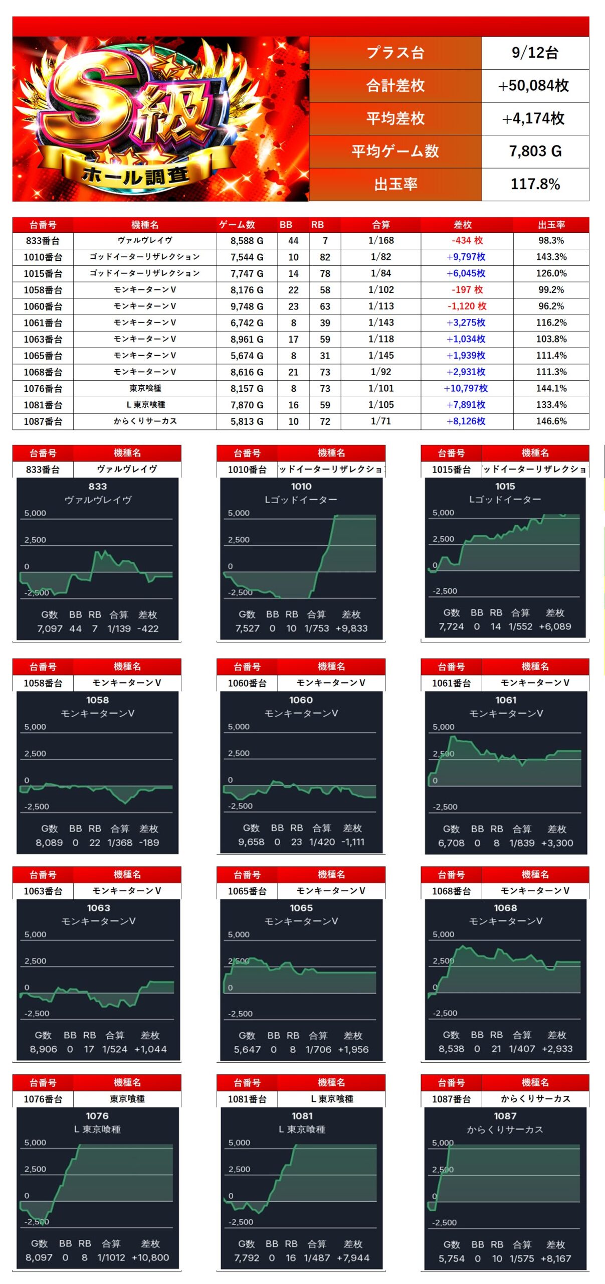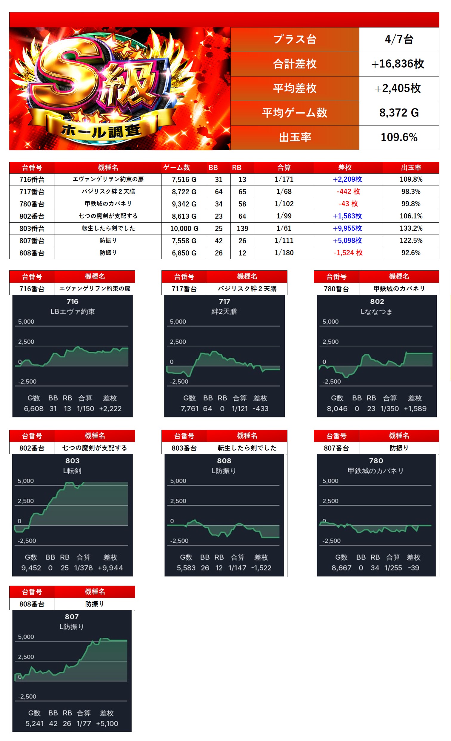 メイン⑤、⑥からは12台をピックアップ。平均差枚+4,174枚、出率117.8%と圧巻の結果を叩き出し、ホール全体の盛り上がりをけん引した。
