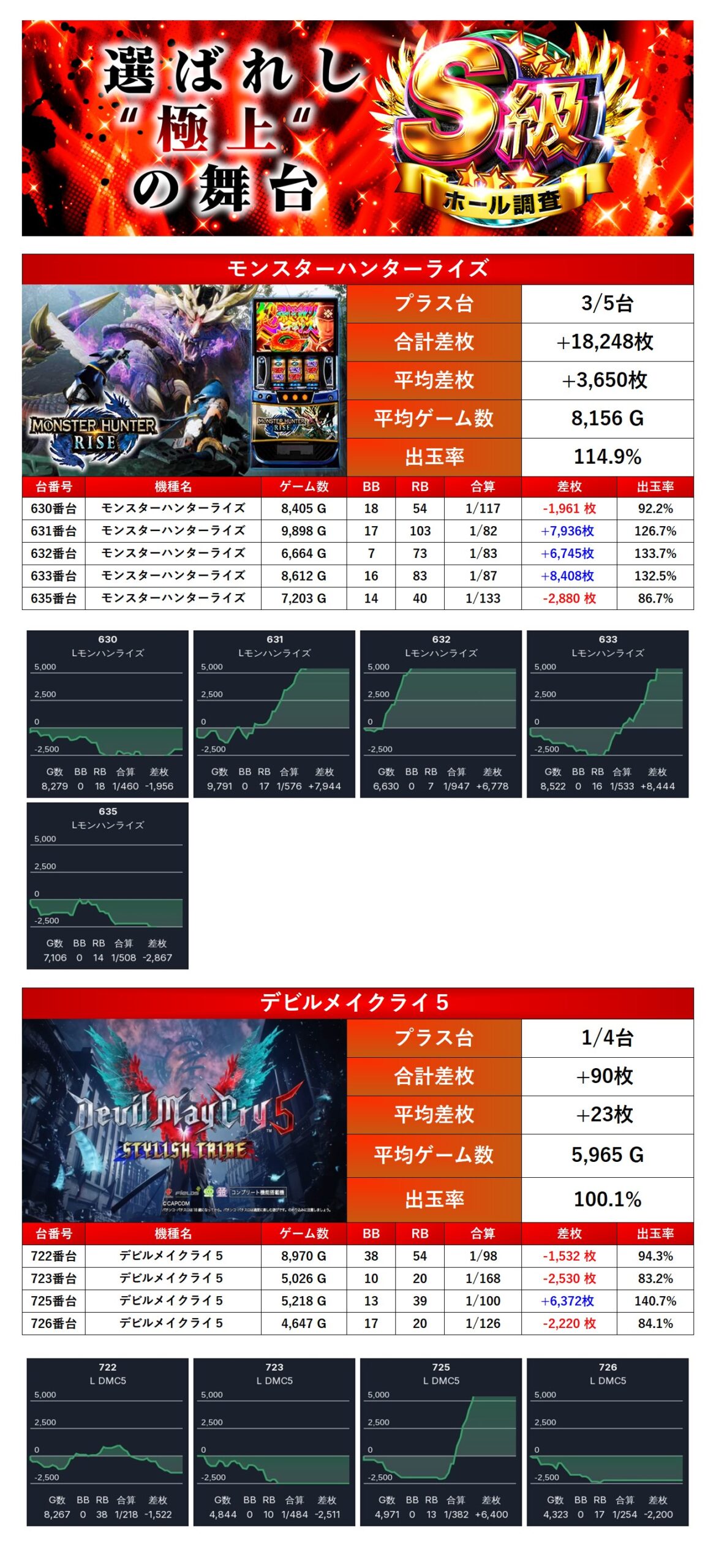「モンハン」「デビルメイクライ」の全台が対象となり、平均差枚+2,038枚、出率109.5%。しっかりと結果を残し、安定した出玉感を見せた。