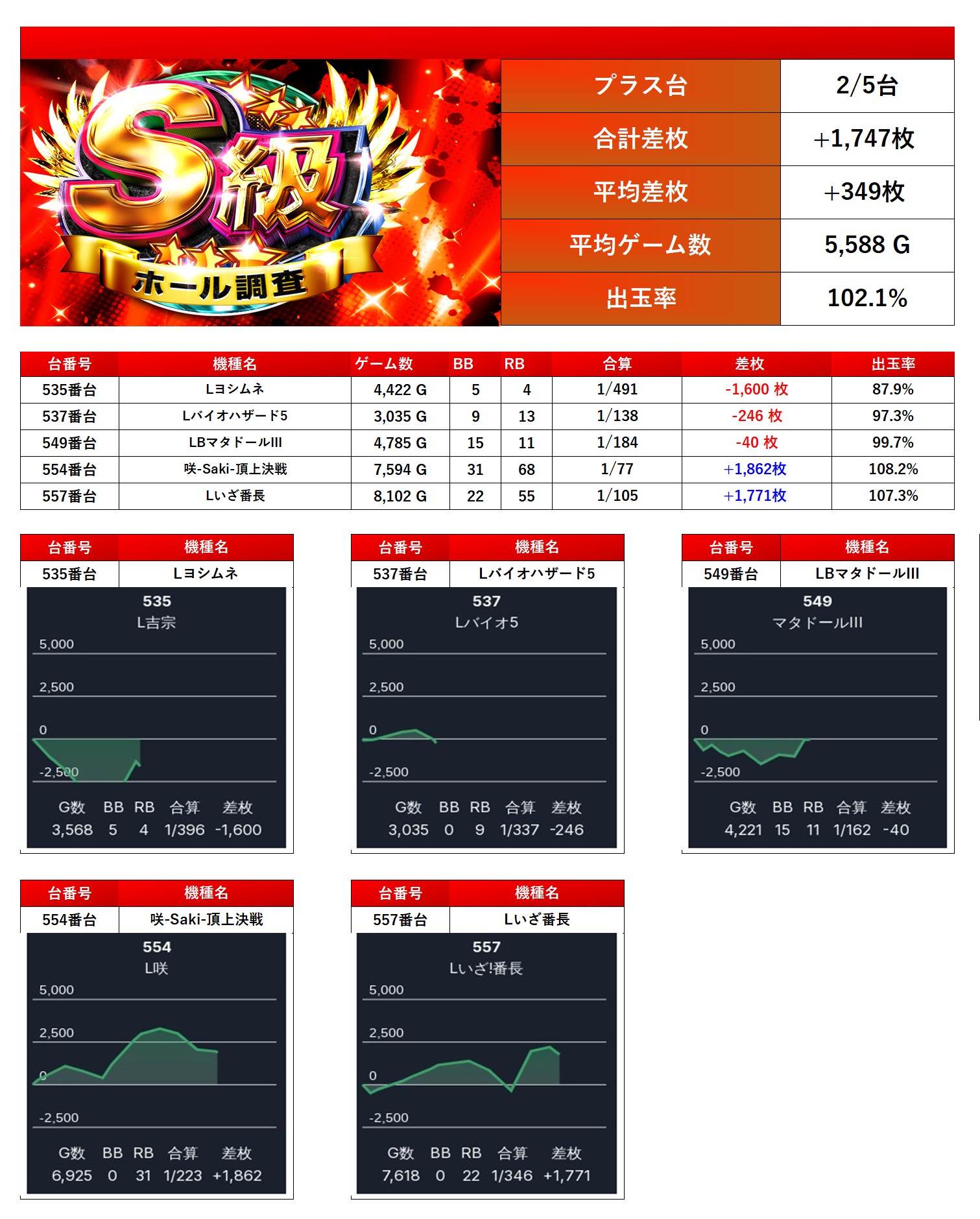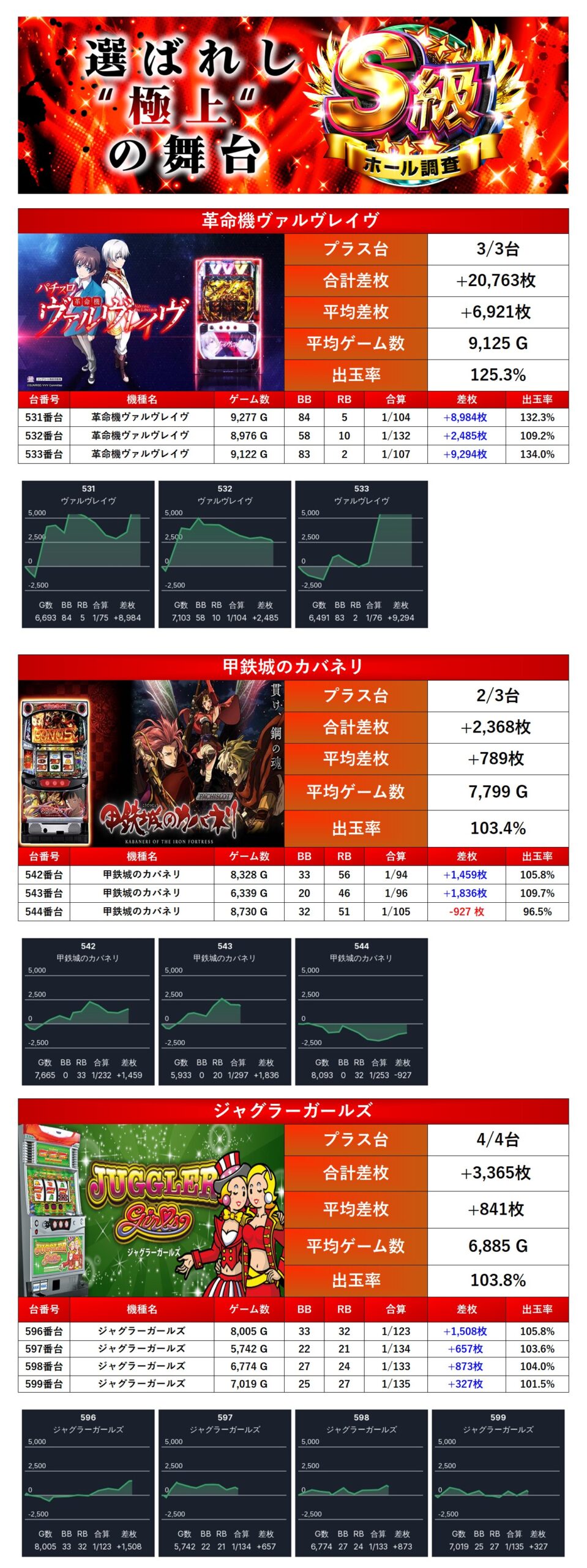 平均差枚は+349枚、平均出率102.1%となった。「吉宗」「いざ番長」と人気機種がpick upされた。