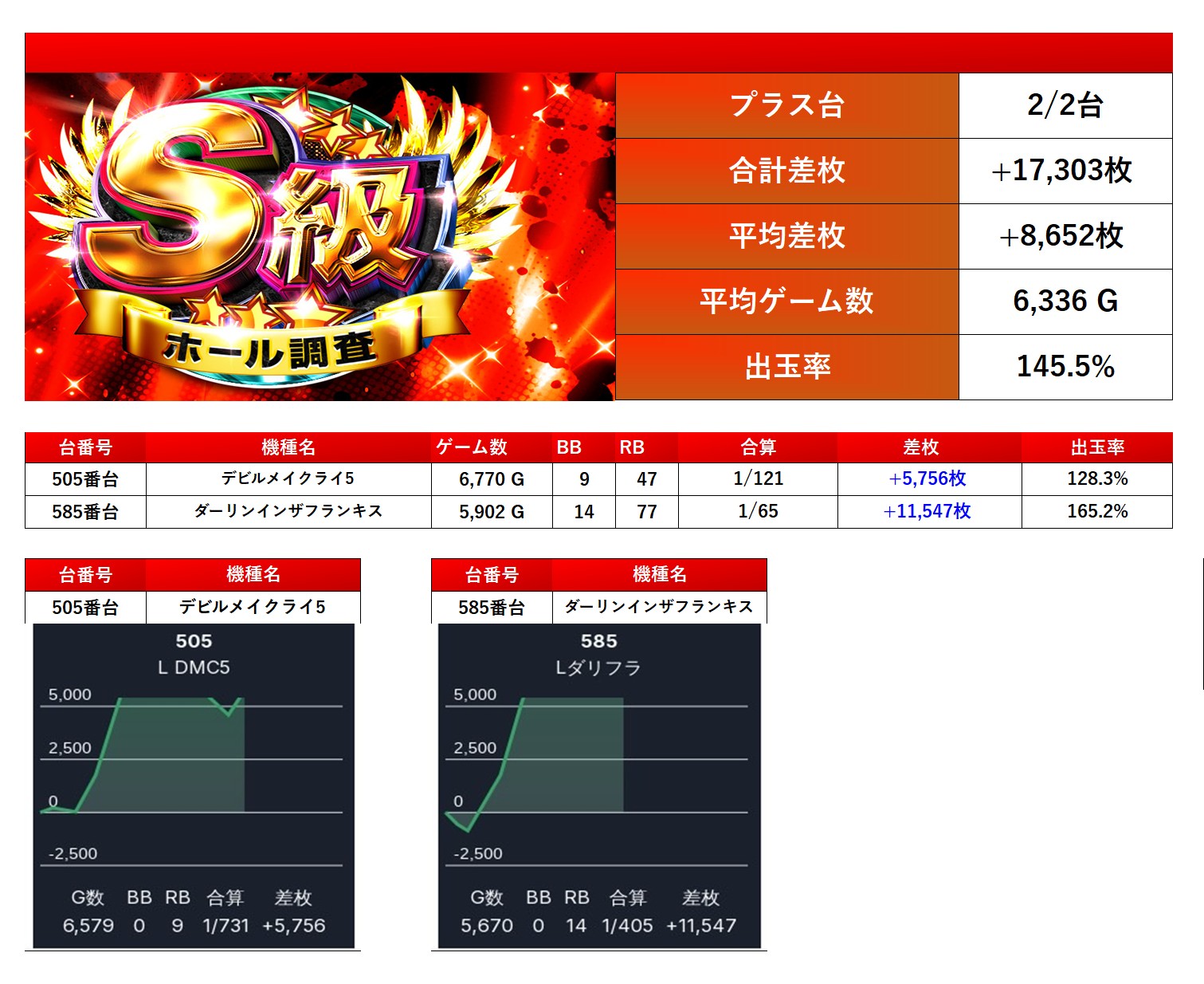 5回目のS級ホール調査-赤-も仕掛け合計出率が完璧で3連続の最高評価三ツ星獲得!