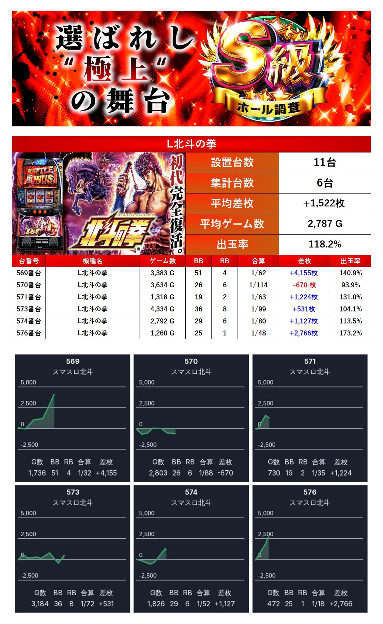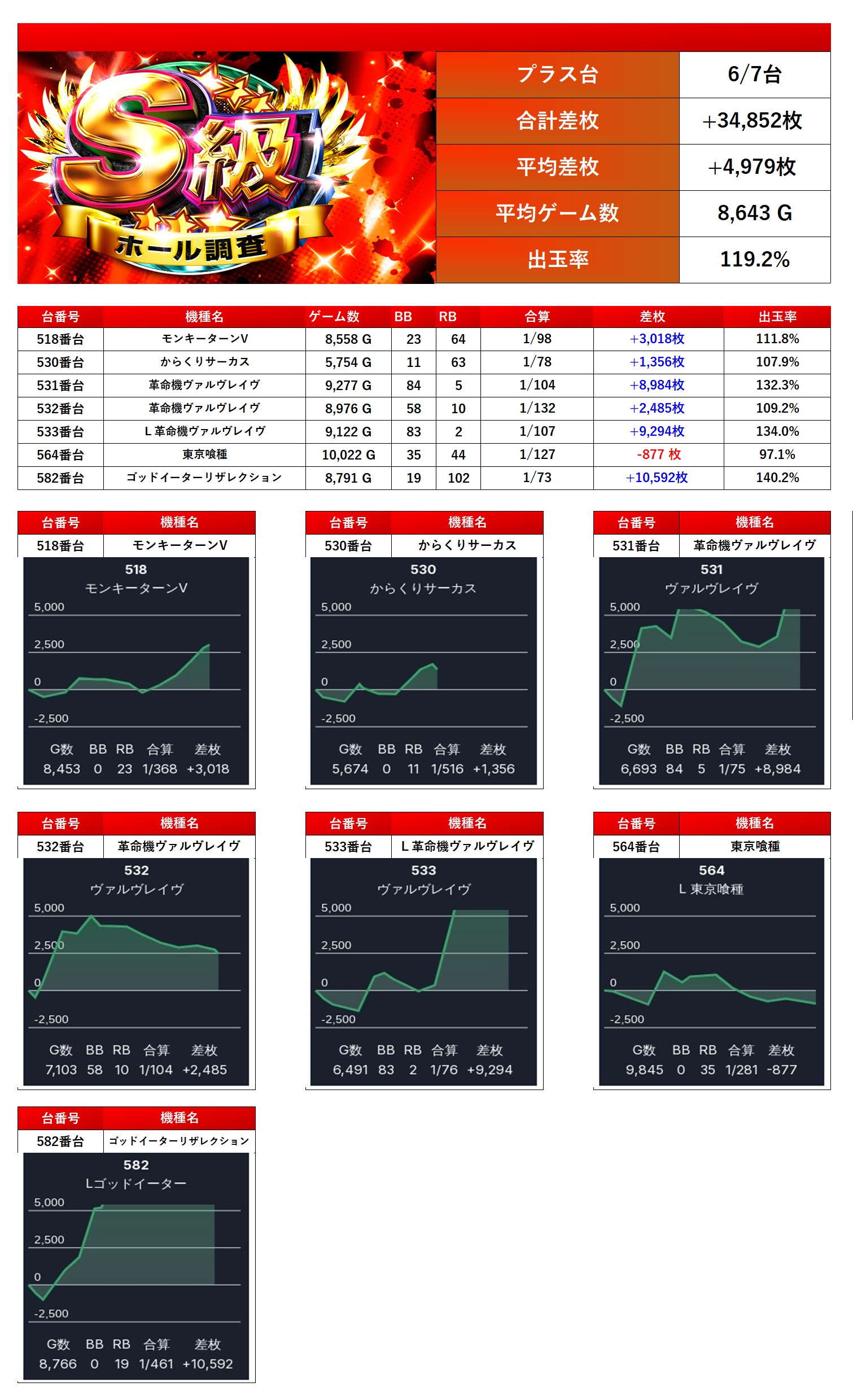 平均差枚+1,522枚、平均出率118.2%となった。多台数機種からpick upがあるのは素晴らしい。