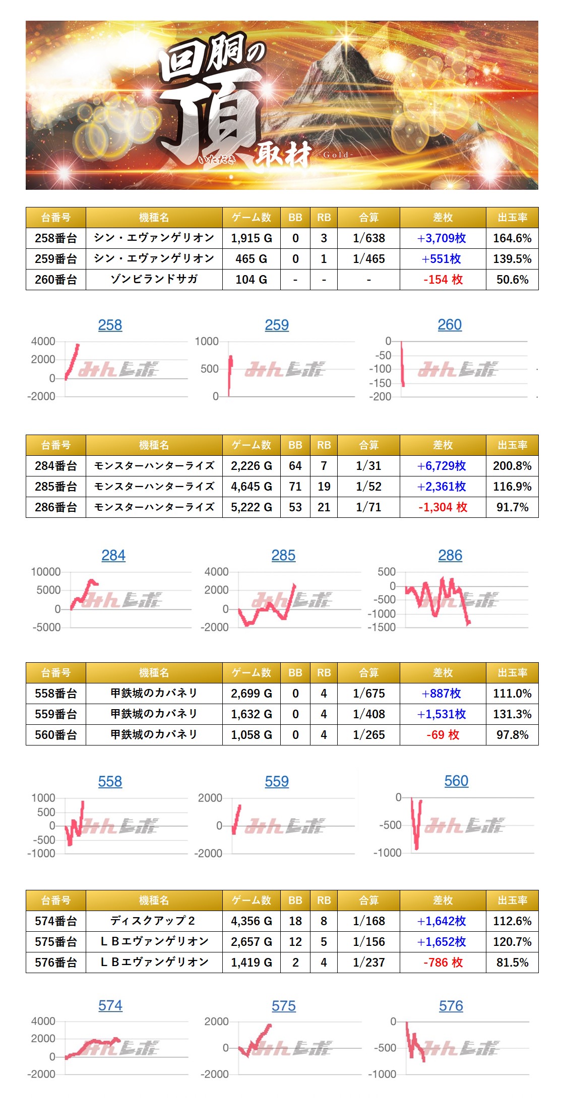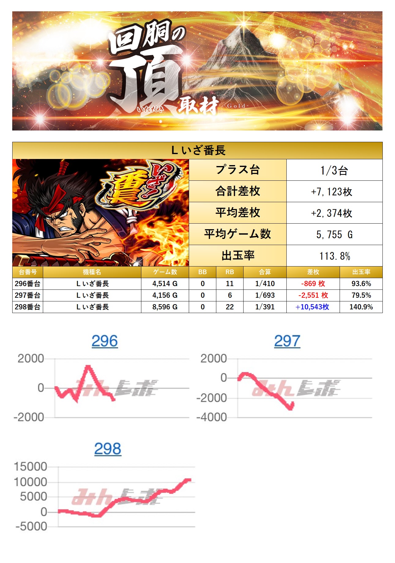 「いざ!番長」1機種をpick upする。1機種3台の平均差枚は+2,374枚で平均出率は113.8%だった。