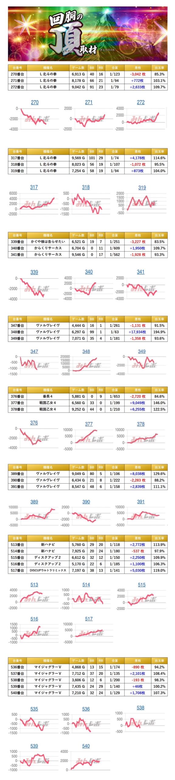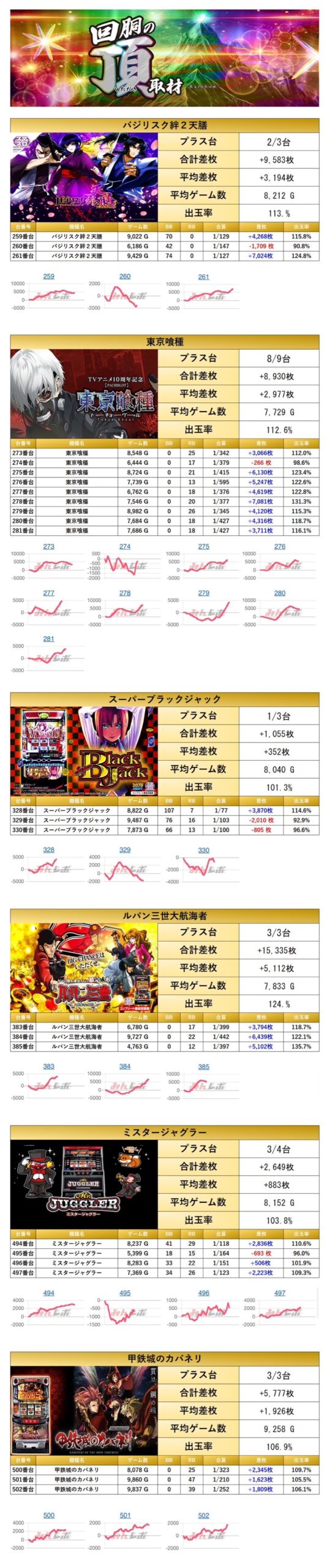 「バジリスク絆天膳」「東京喰種」「スーパ-ブラックジャック」「ルパン大航海者」「ミスタ-ジャグラ-」「カバネリ」の6機種をpick upする。6機種25台の平均差枚は+2,986枚で平均出率が112.4%だった。