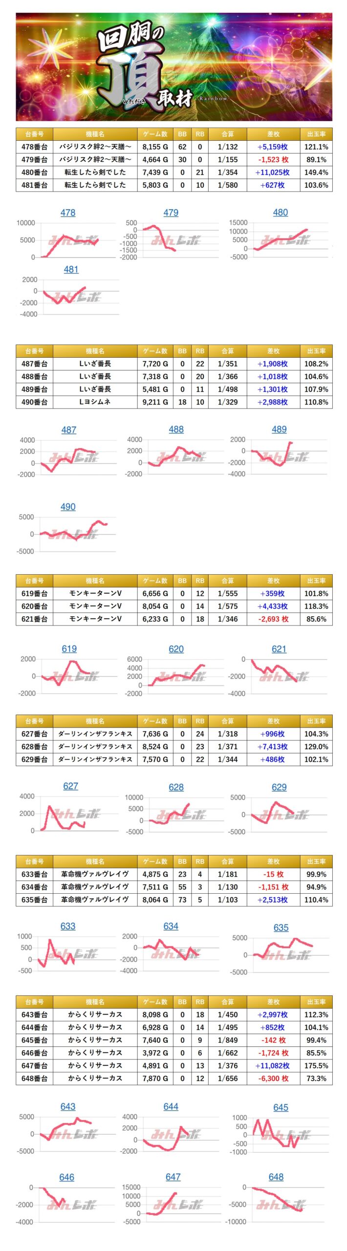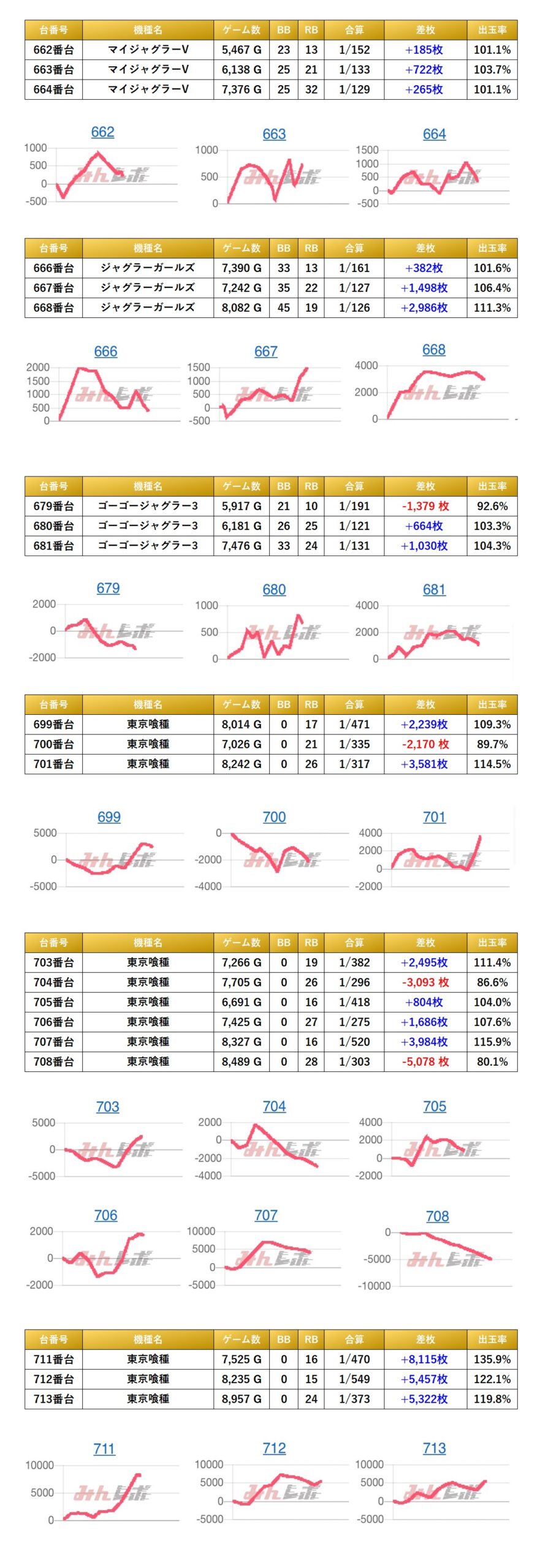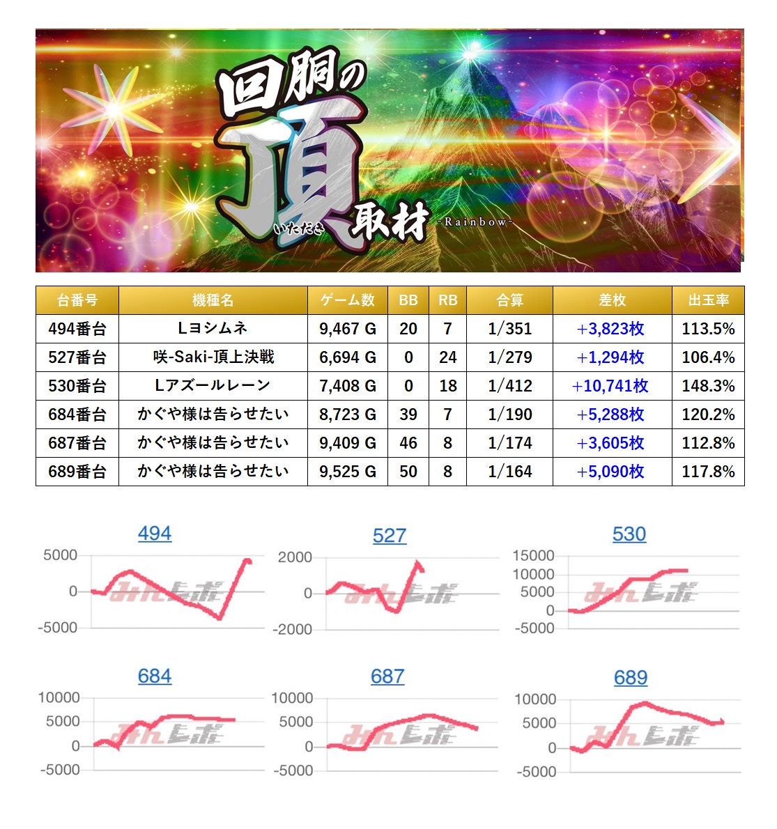 今回は4機種6台の優秀台を発見した。平均差枚は+4,974枚で平均出率が119.4%とまとまった出玉をみせた。