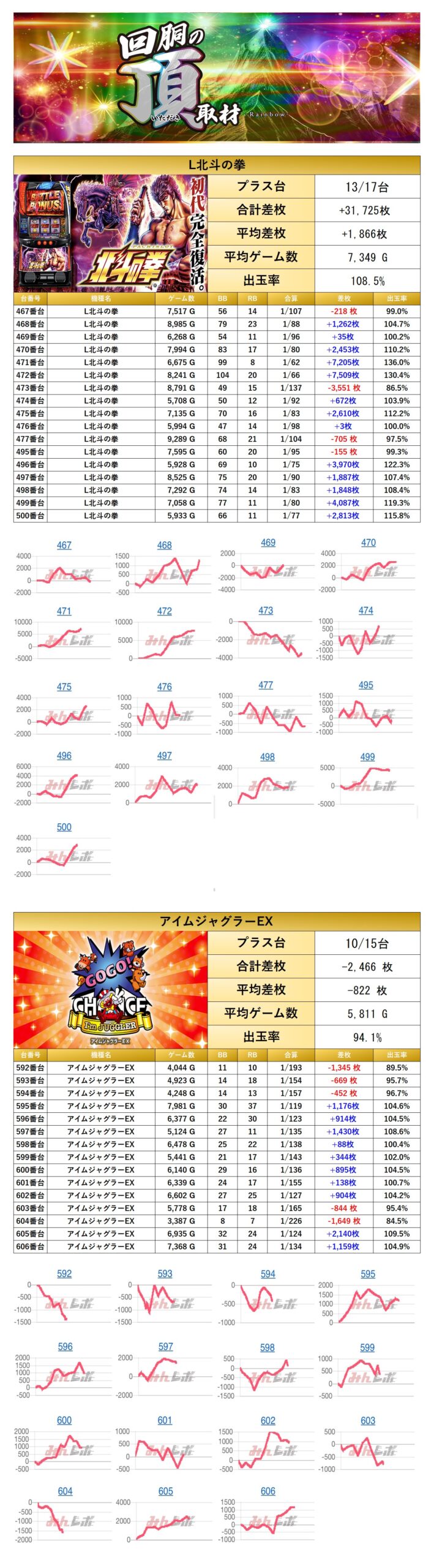 「北斗の拳」「アイムジャグラー」の2機種をpick upする。2機種32台の平均差枚は+1,124枚で平均出率が105.5%だった。