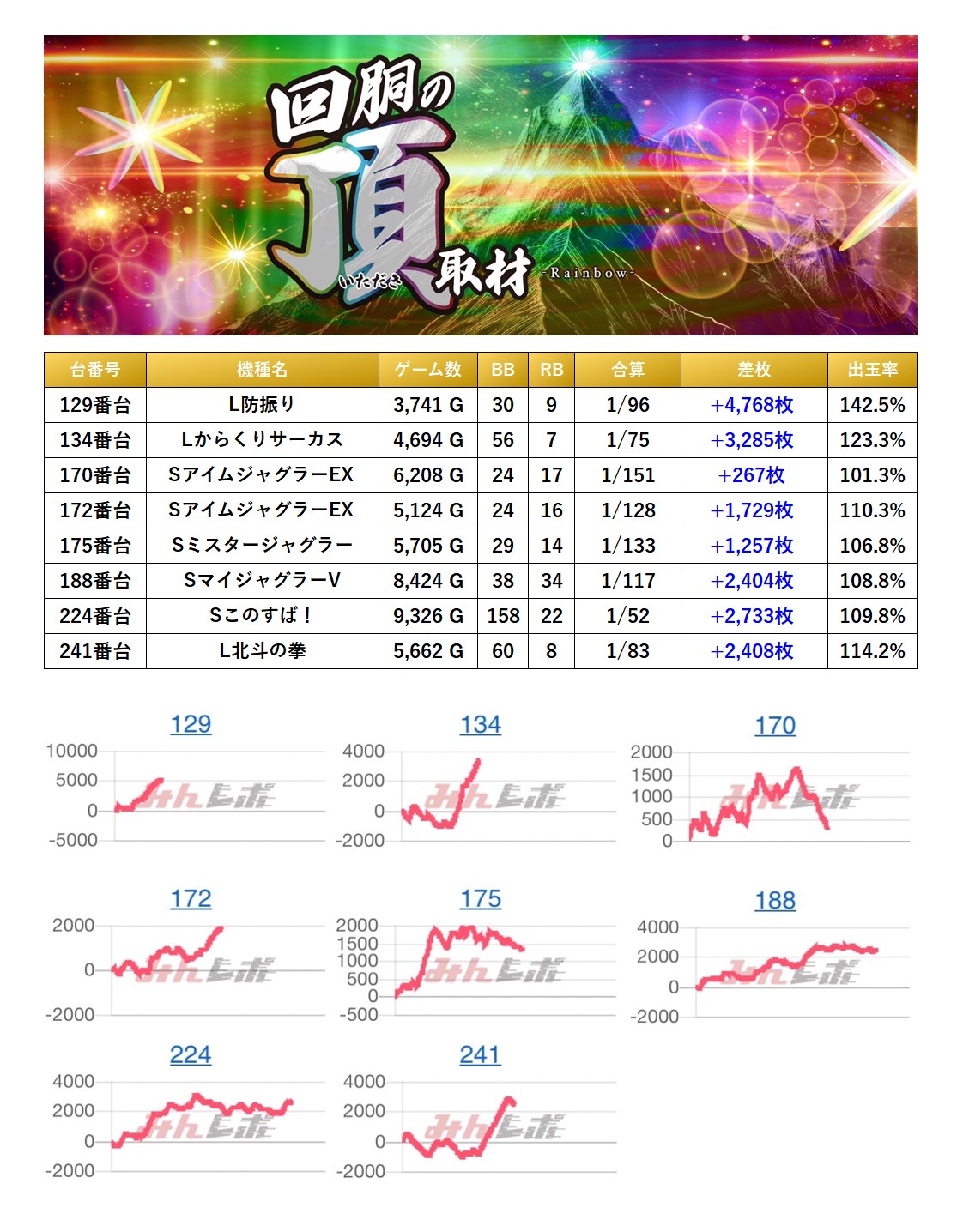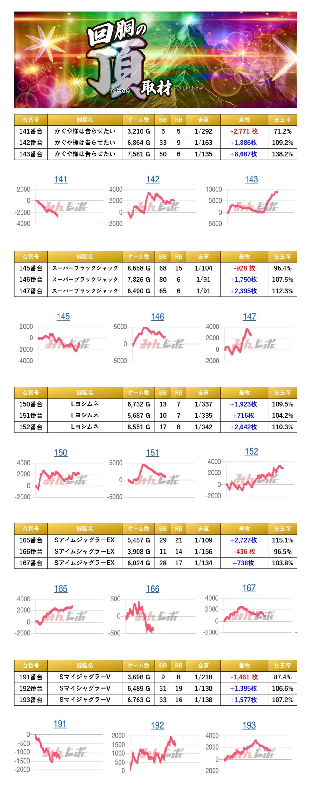 「かぐや様は告らせたい」「スーパーブラックジャック」「L吉宗」「アイムジャグラー」「マイジャグ」の5箇所3台並び見つけることができた。5箇所15台の平均差枚は+1,389枚で平均出率が107.2%だった。