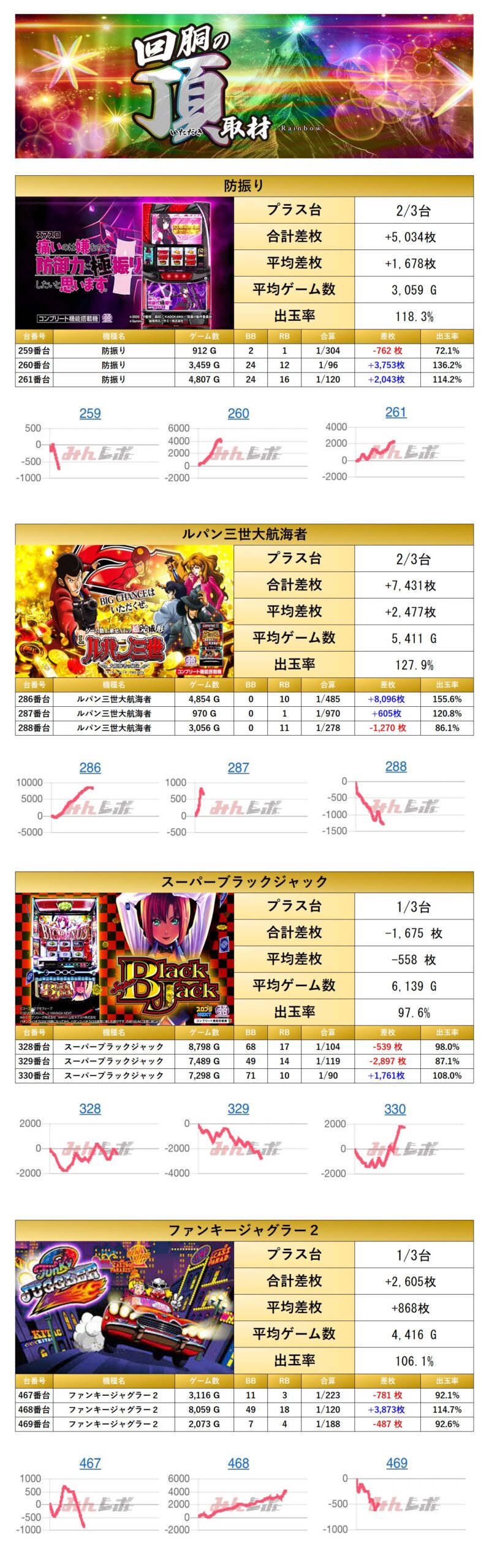 「防振り」「ルパン三世」「スーパ-ブラックジャック」「ファンキージャグラ-」の4機種をpick upする。4機種12台の平均差枚は+1,116枚で平均出率が108.0%だった。