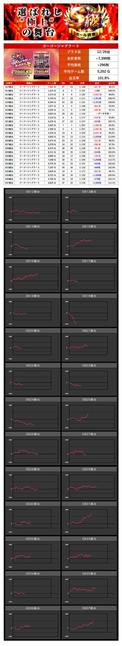 平均差枚+296枚、平均出率101.8%となった。こんな多台数機種が対象になるとは驚きだ。ゲーム数が少ない台もあり、全台打ち込まれたならば結果は変わっていたのかもしれない。