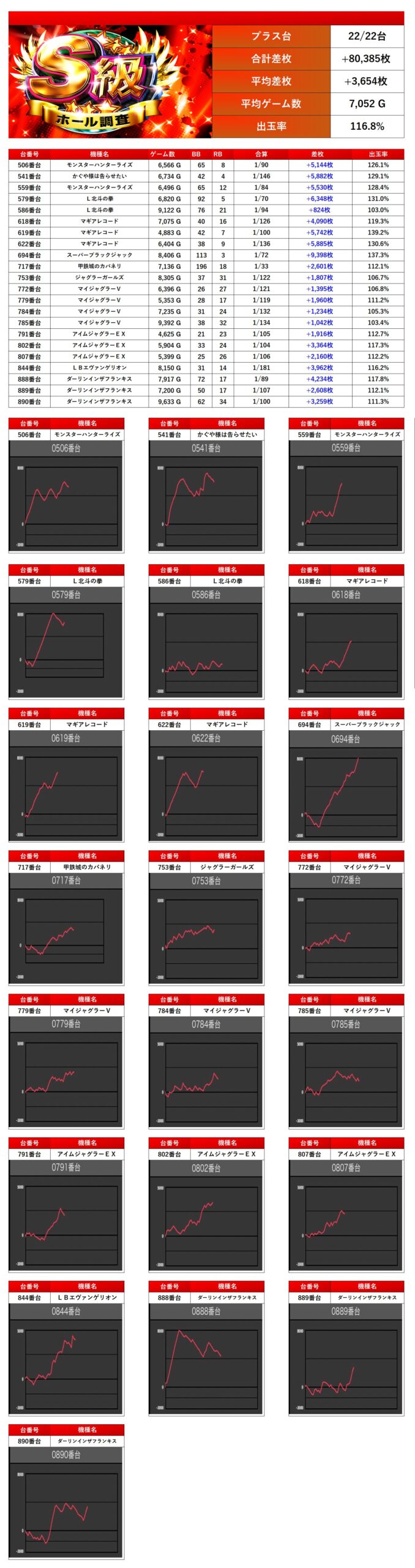 平均差枚は+3,654枚、平均出率116.8%となった。人気機種から質の高い台が数多く輩出された。