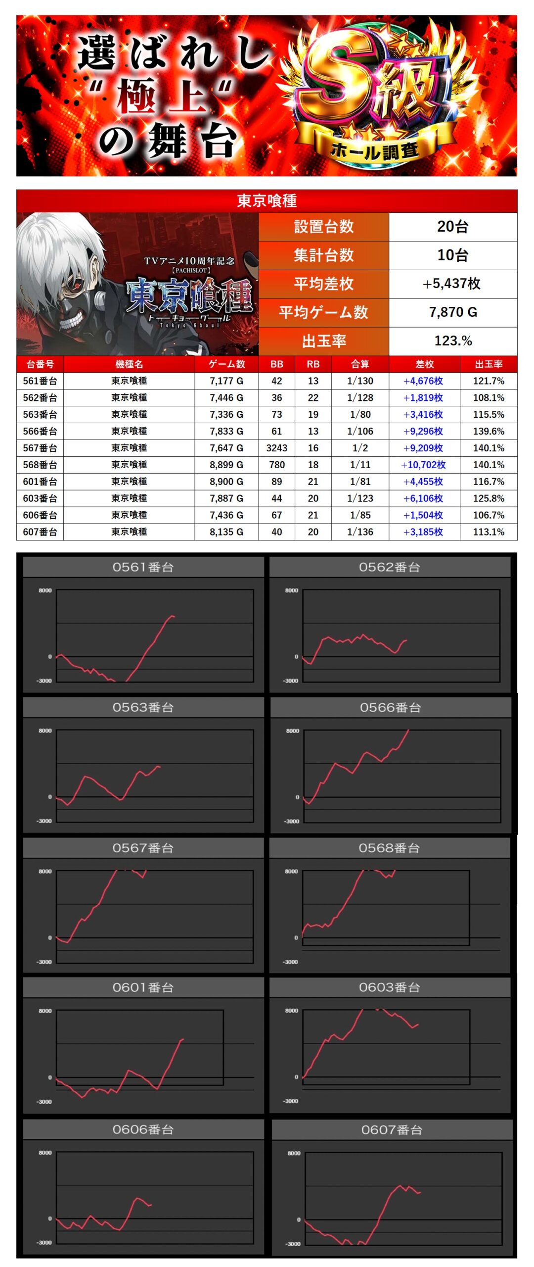 平均差枚+4,557枚、平均出率119.7%となった。3機種ともとにかく高い勝率なのが素晴らしい。喰種に限っては勝率100%になった。