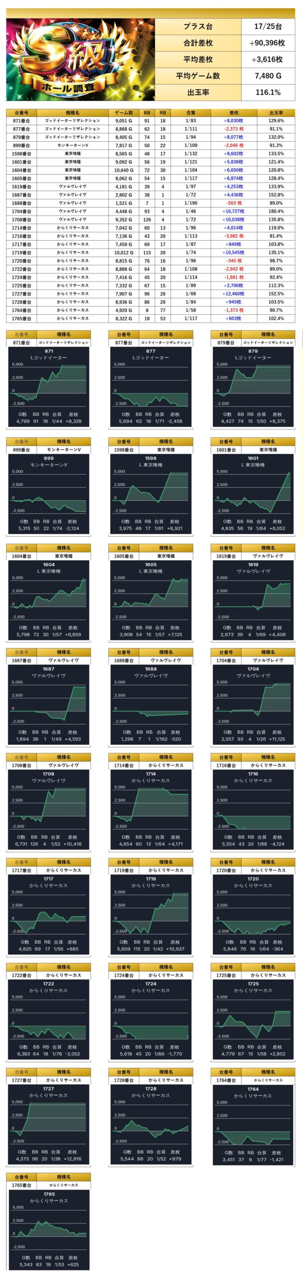 「東京喰種」「ヴヴヴ」「からくり」「ゴッドイーター」「モンキー」から優秀台を25台pick upする。25台の平均差枚は+3,616枚で平均出率が116.1%だった。