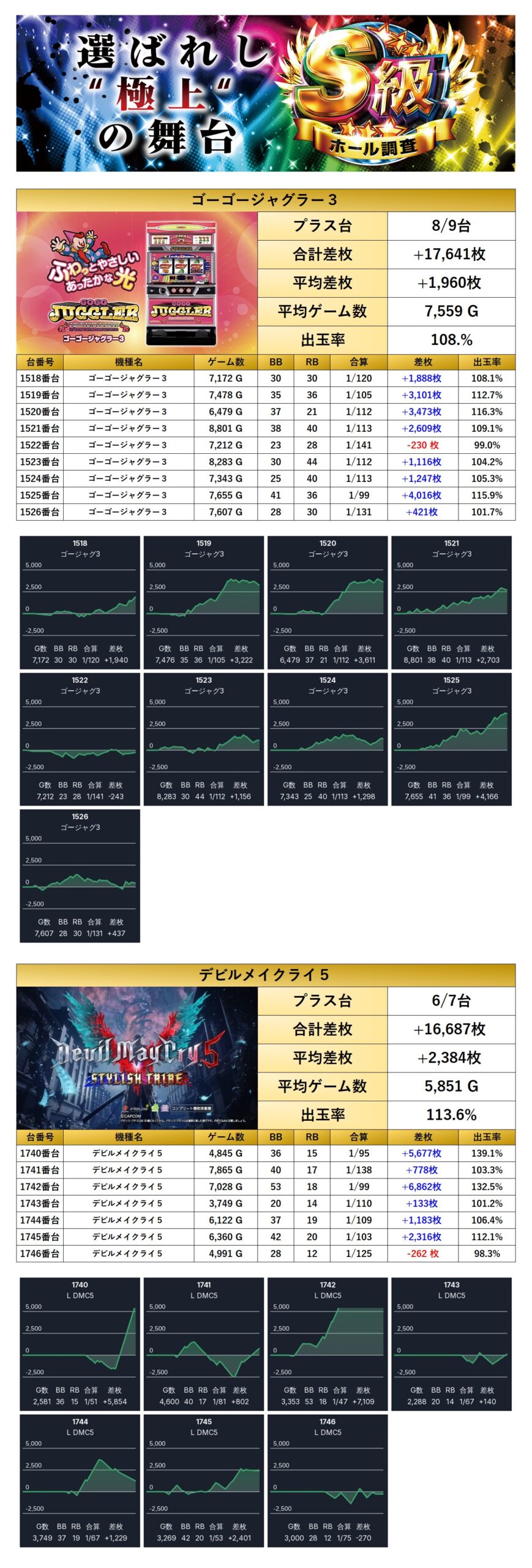 「ゴージャグ3」「デビルメイクライ5」の2機種をpick upする。2機種16台の平均差枚は+2,146枚で平均出率が110%だった。