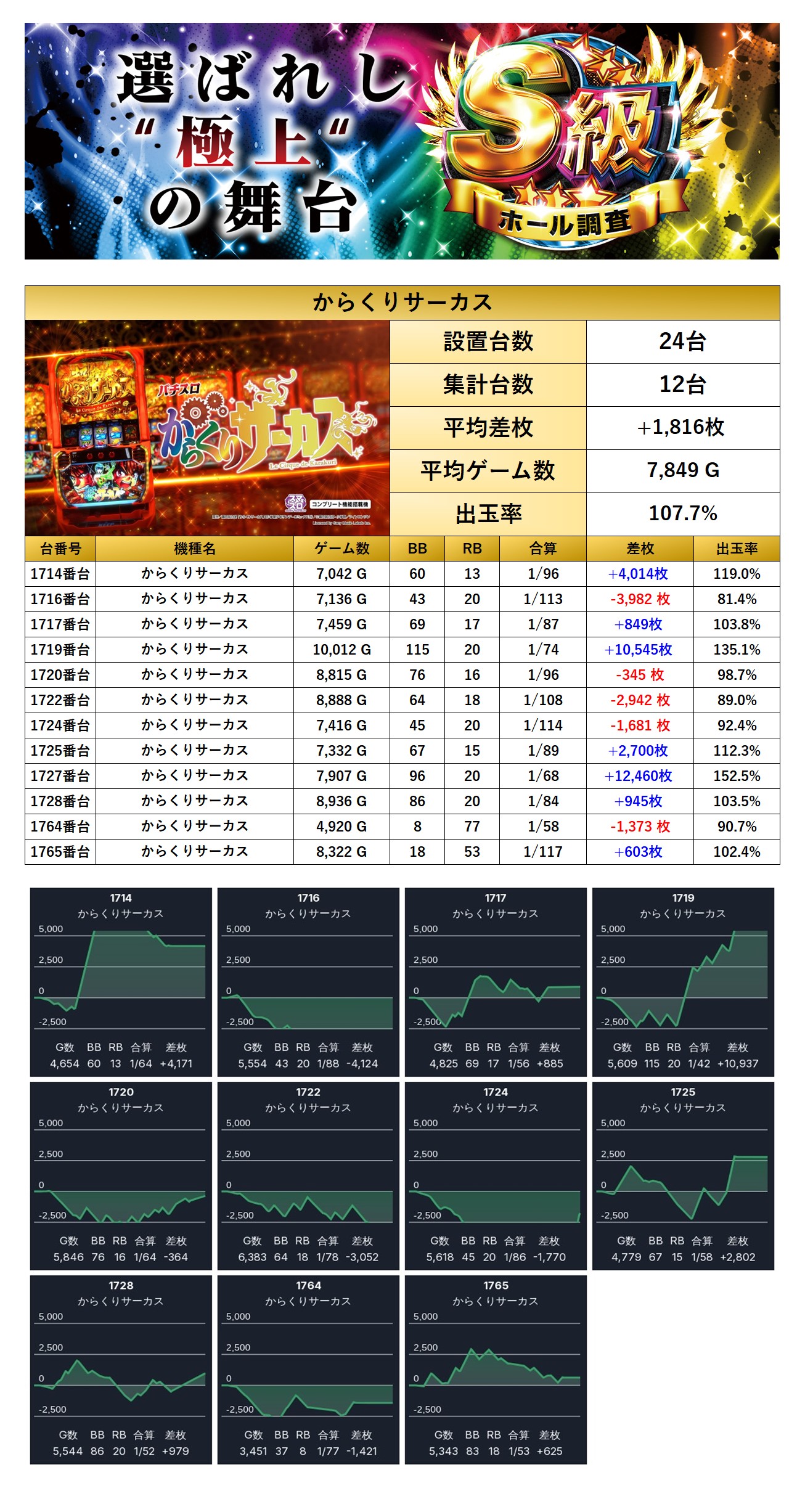 「からくりサーカス」の1機種をpick upする。1機種12台の平均差枚は+1,816枚で平均出率が107.7%だった。