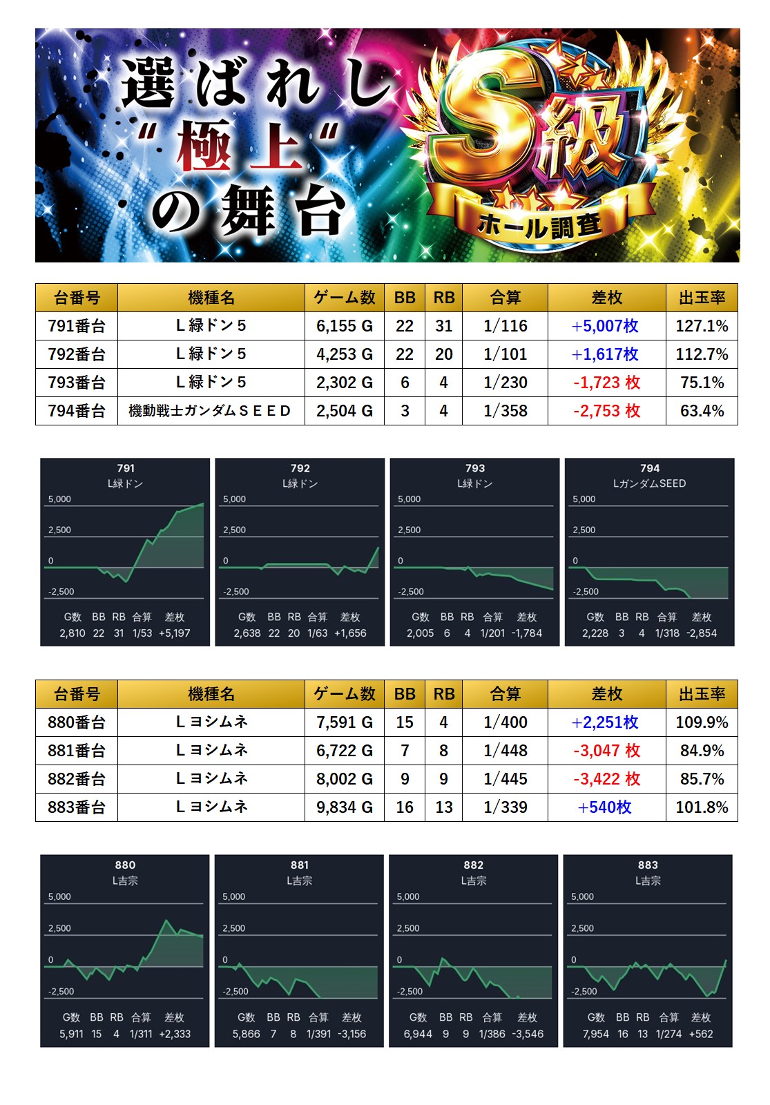 8回目となったS級調査-虹-は2回連続の三ツ星評価を獲得!どんな抽選番号でも戦える状況であったと推測できる仕掛け数となっている。全体を見ても設置台数の21.9%がpick up。さらにこの日は総計機種の109台総差枚+31万枚オーバーを記録し仕掛け量だけでなく出玉でもユーザーの期待に応える結果となった。個別にみると、「全台が好調な機種」は2機種pick up、「設置の半分が好調な機種」は1機種pick up、「4台以上並び」は4台並び2箇所の計8台pick up、「4台設置以上機種」からは60台ものpick upとなった。仕掛けの量と質は素晴らしい結果だ。今回も圧倒的な結果を残してくれた。3回連続の最高評価を獲得してほしい。次回の調査にはかなりの期待をしている。