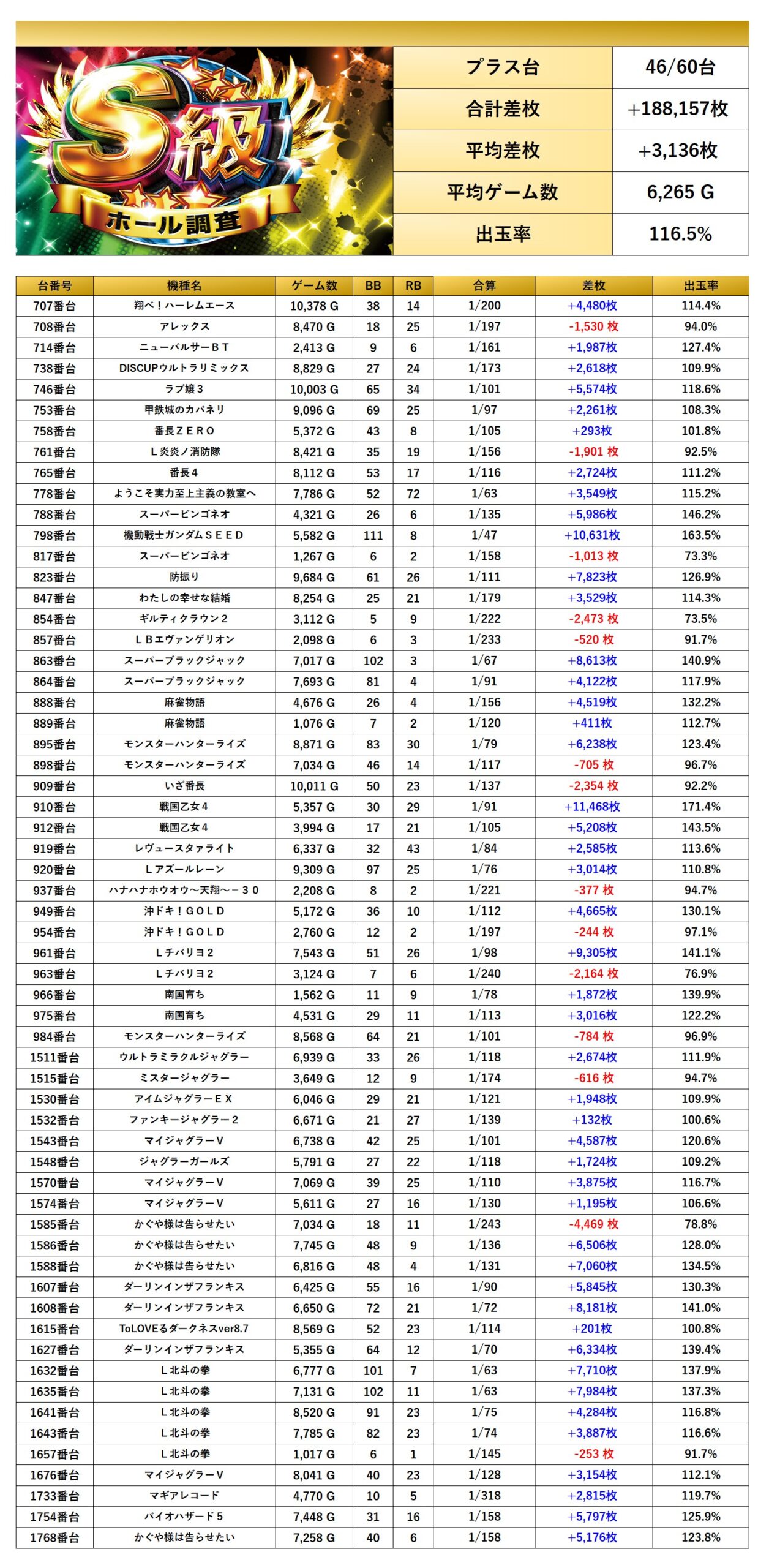 4台以上設置機種から優秀台を探すと60台もpick upする事ができた。平均差枚は+3,136枚で平均出率が116.5%と優秀な結果を誇った。