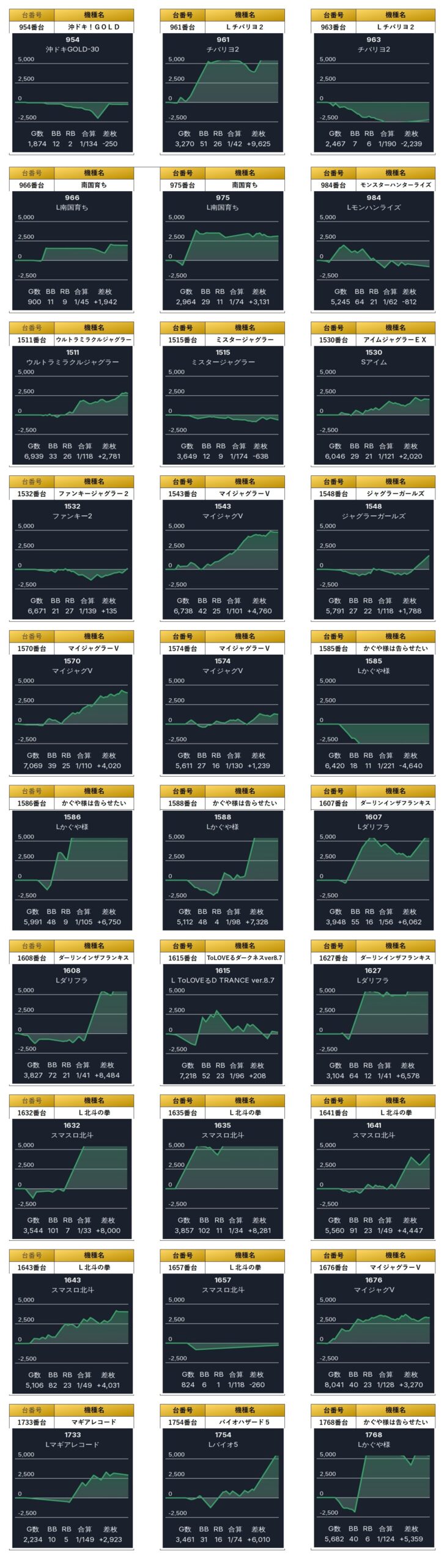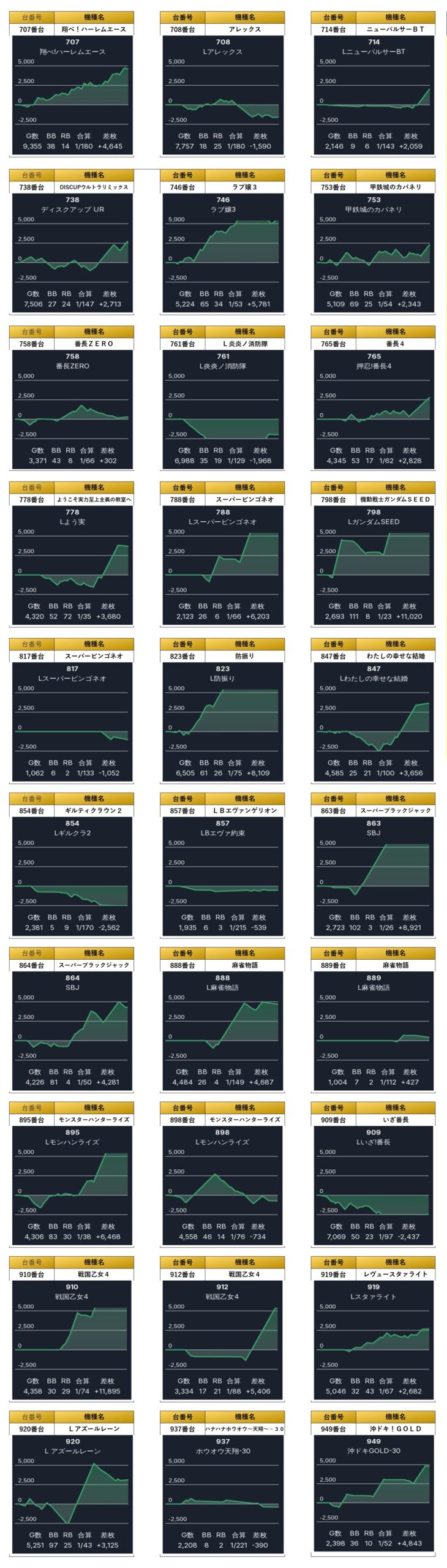 4台並びが2箇所、計8台をpick upする。2箇8台の平均差枚は−191枚で平均出率が98.9%といまいち伸ばし切れず惜しい結果だった。