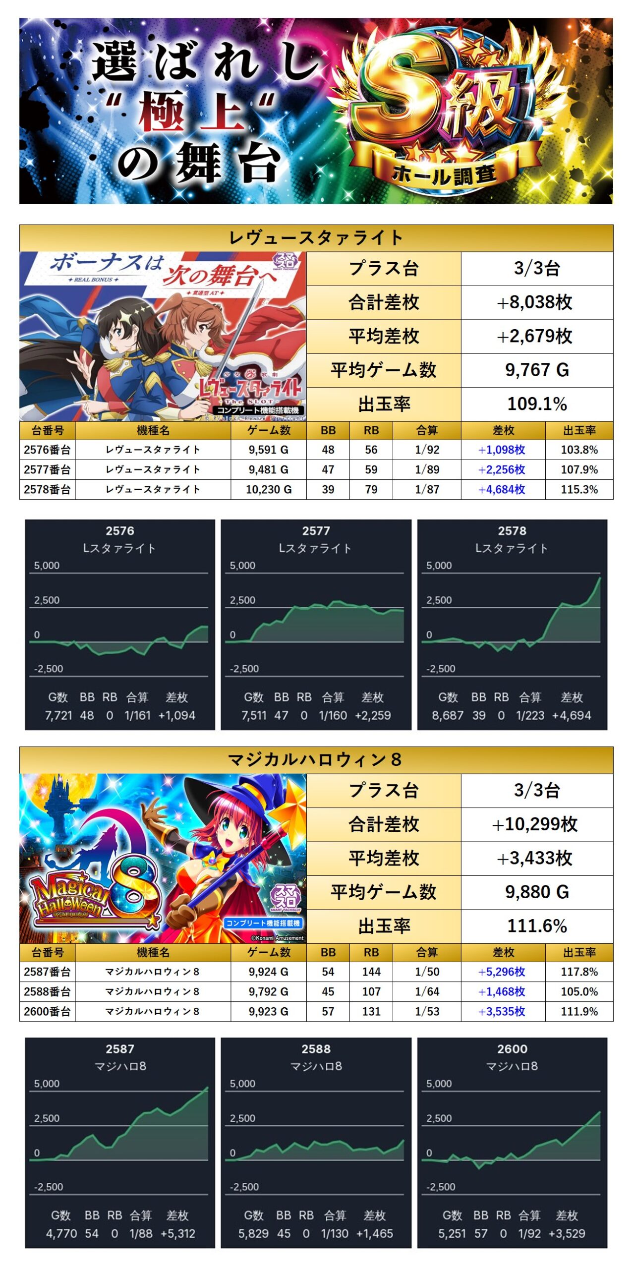 しかし「レヴュースタァライト」「マジカルハロウィン8」の全台系や「ニブイチ機種」「4台設置機種」など、多彩な仕掛けが随所で確認され、要所では見ごたえのある結果を残した。