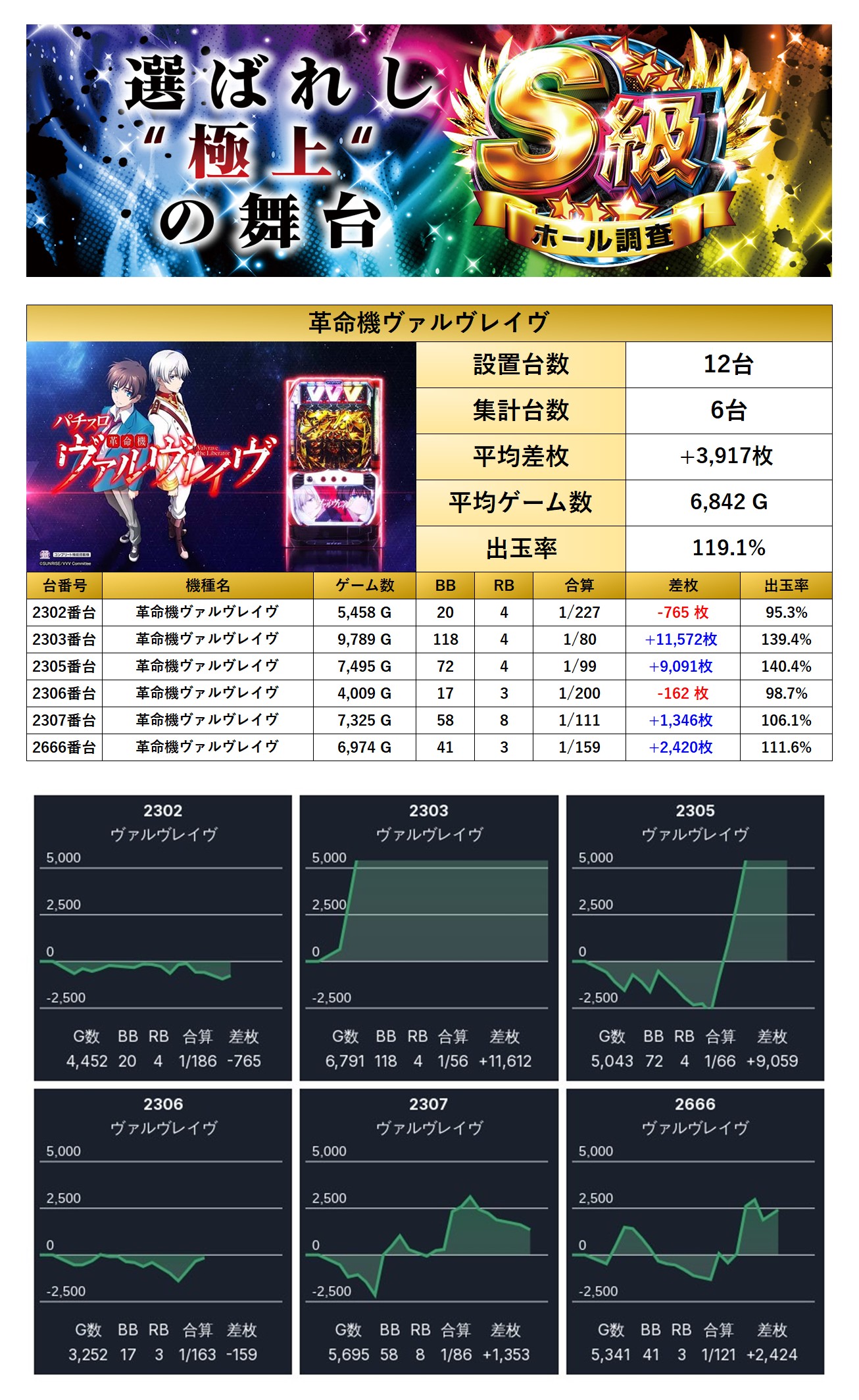 メイン機で紹介した「ヴヴヴ」の1機種をpick upする。1機種6台の平均差枚は+3,917枚で平均出率が119.1%と万枚OVERの台も確認でき、素晴らしい結果だった。