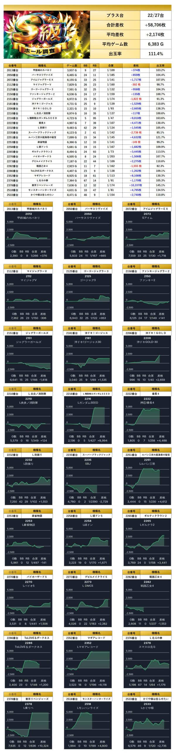 4台以上設置機種から優秀台を探すと27台もpick upする事ができた。27台の平均差枚は+2,174枚で平均出率が111.4%と多彩な仕掛け量だった。
