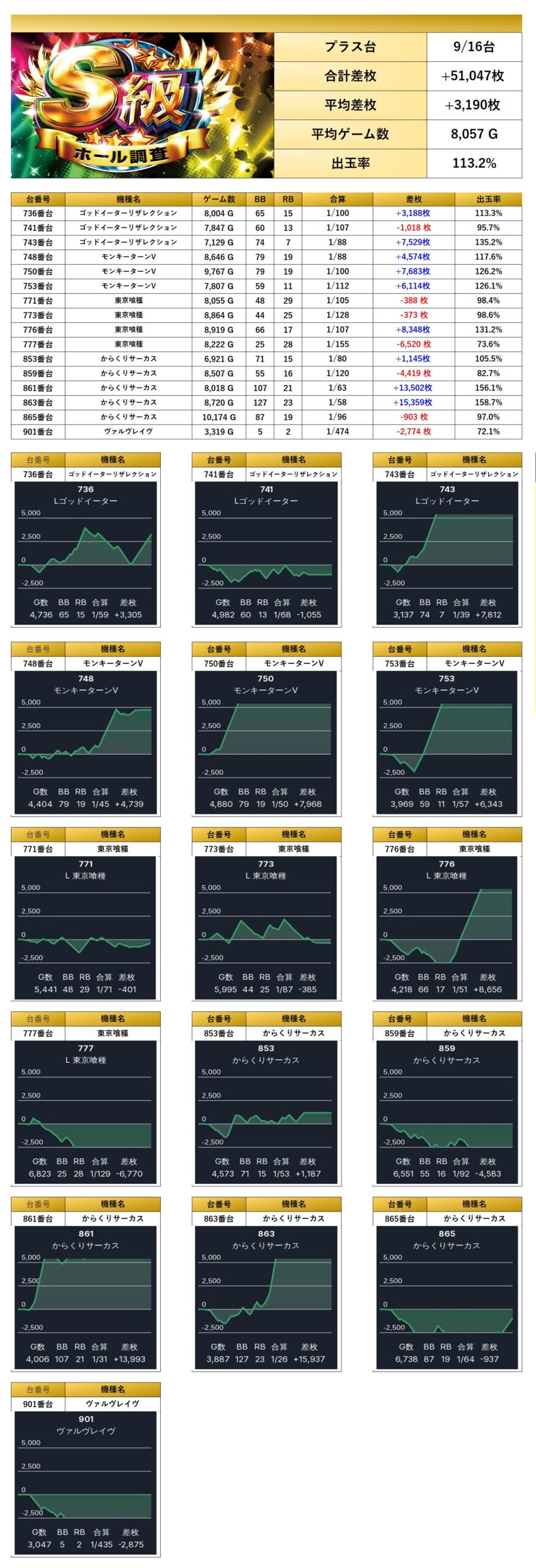 平均差枚は+3,190枚で平均出率が113.2%となりメイン機種らしい圧巻の出玉を誇った。