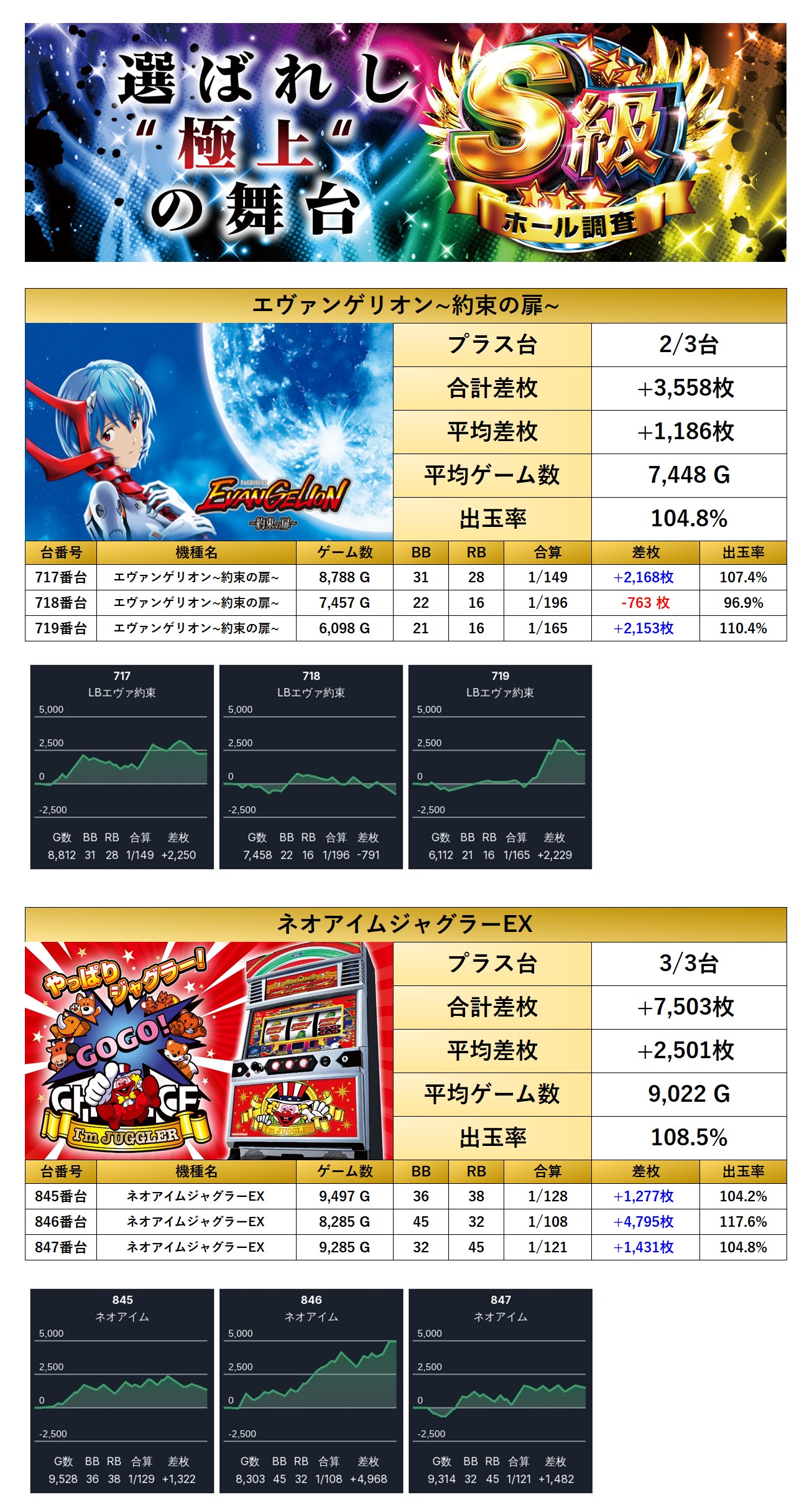 「エヴァンゲリオン~約束の扉~」「ネオアイムジャグラー」の2機種6台ををpick upする。