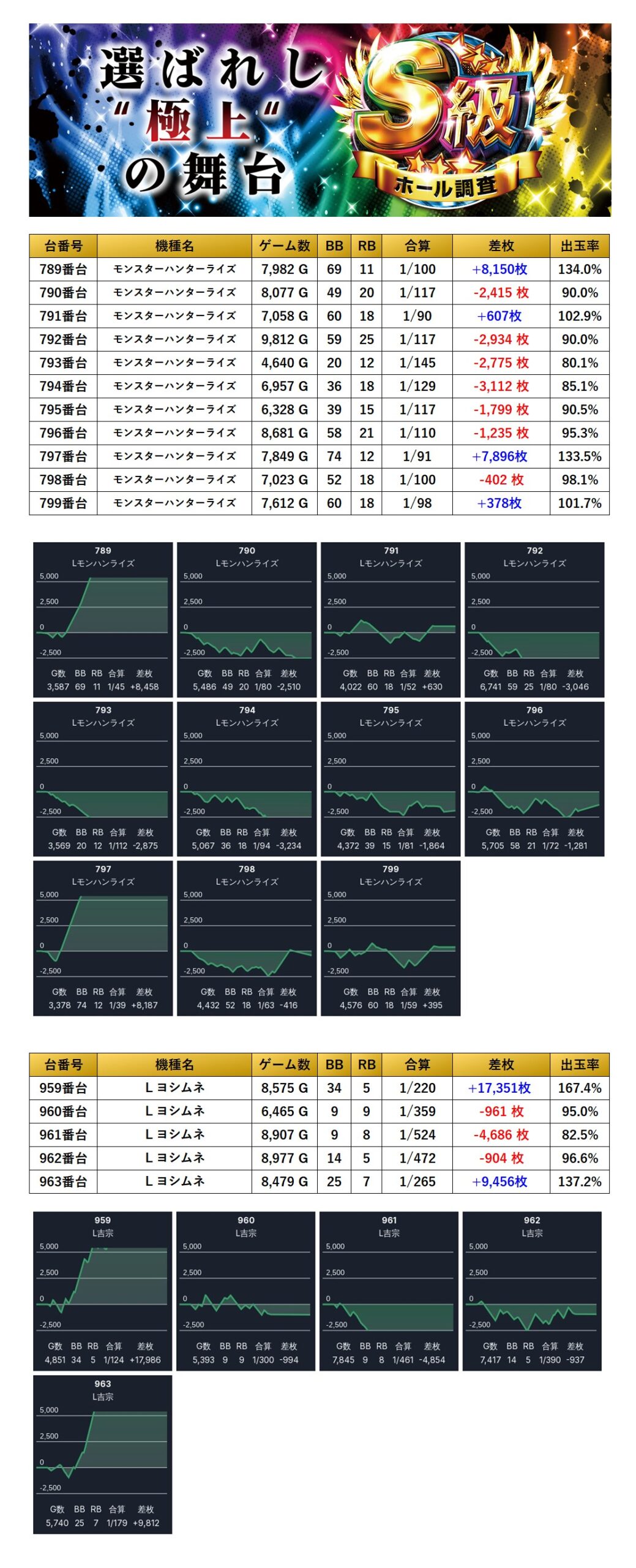 9回目となったS級調査-虹-は仕掛け全体を見ると設置台数の26.4%がpick upと驚愕の数値だ。個別にみると「メイン機種」では平均差枚+3,190枚と優秀な結果だった。「全台が好調な機種」は2機種pick up、「設置の半分が好調な機種」は2機種pick up、「4台以上並び」は2箇所計16台もをpick up、「4台設置機種」は23台をpick upとなりユーザーがしっかり探せる仕掛けになっていた。多彩な仕掛けが随所で確認され、要所では見ごたえのある結果を残した。過去の傾向通り安定した仕掛け量と質で出玉もよかったが、あともう一歩のところで三つ星に届かず今回は二つ星評価となる。次回も期待している。