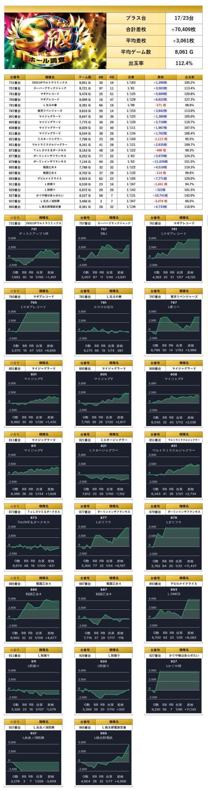 平均差枚は+3,061枚で平均出率が112.4%と優秀な結果を叩きだしてくれた。