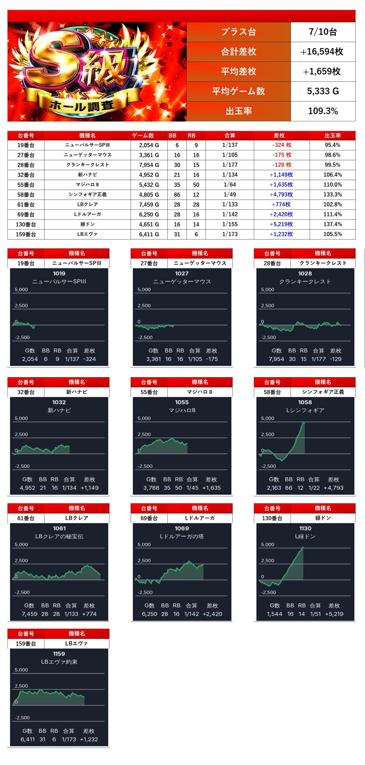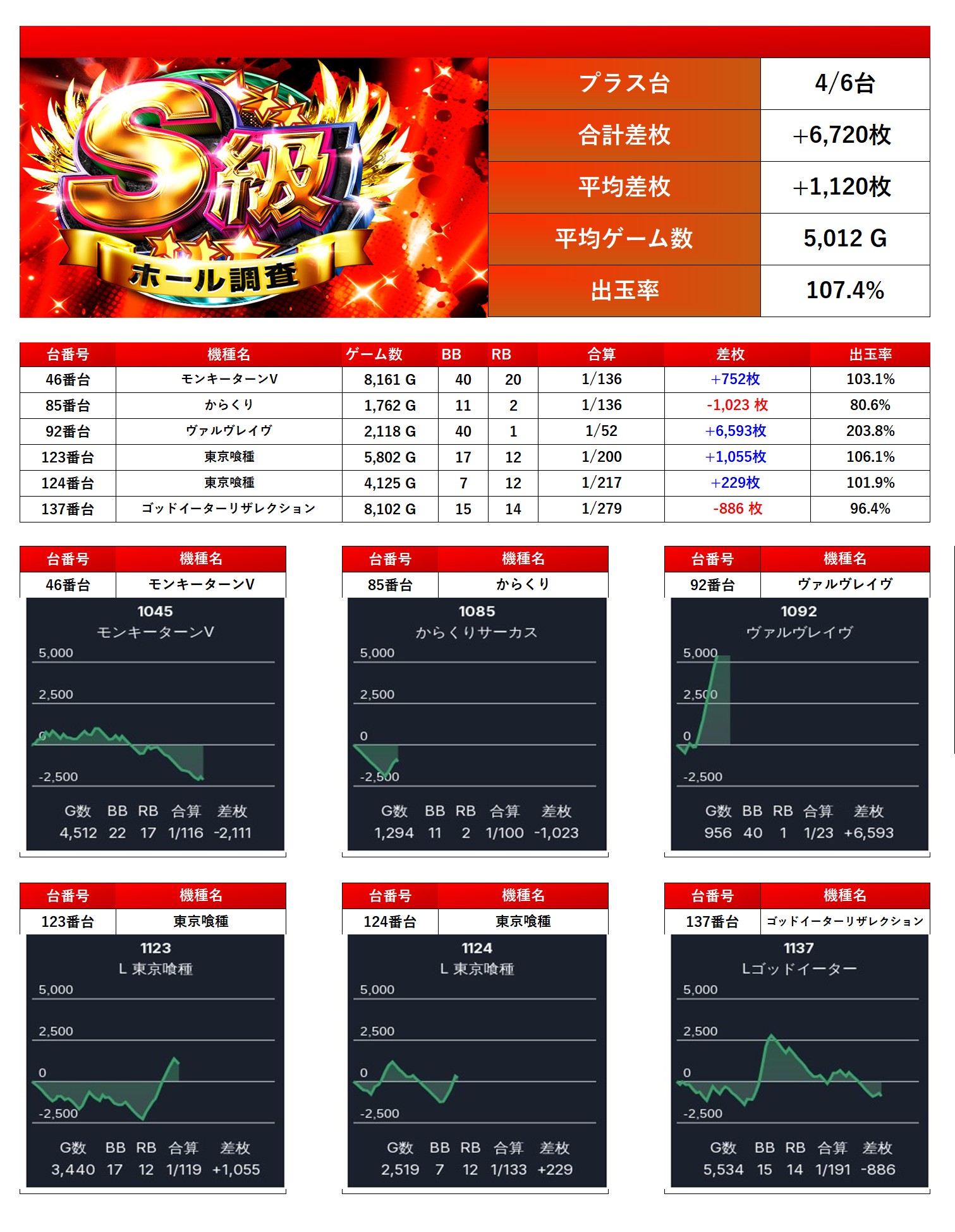 平均差枚+1,120枚、平均出率107.4%となった。どの台もしっかり粘られていて状況は良さそうだ。