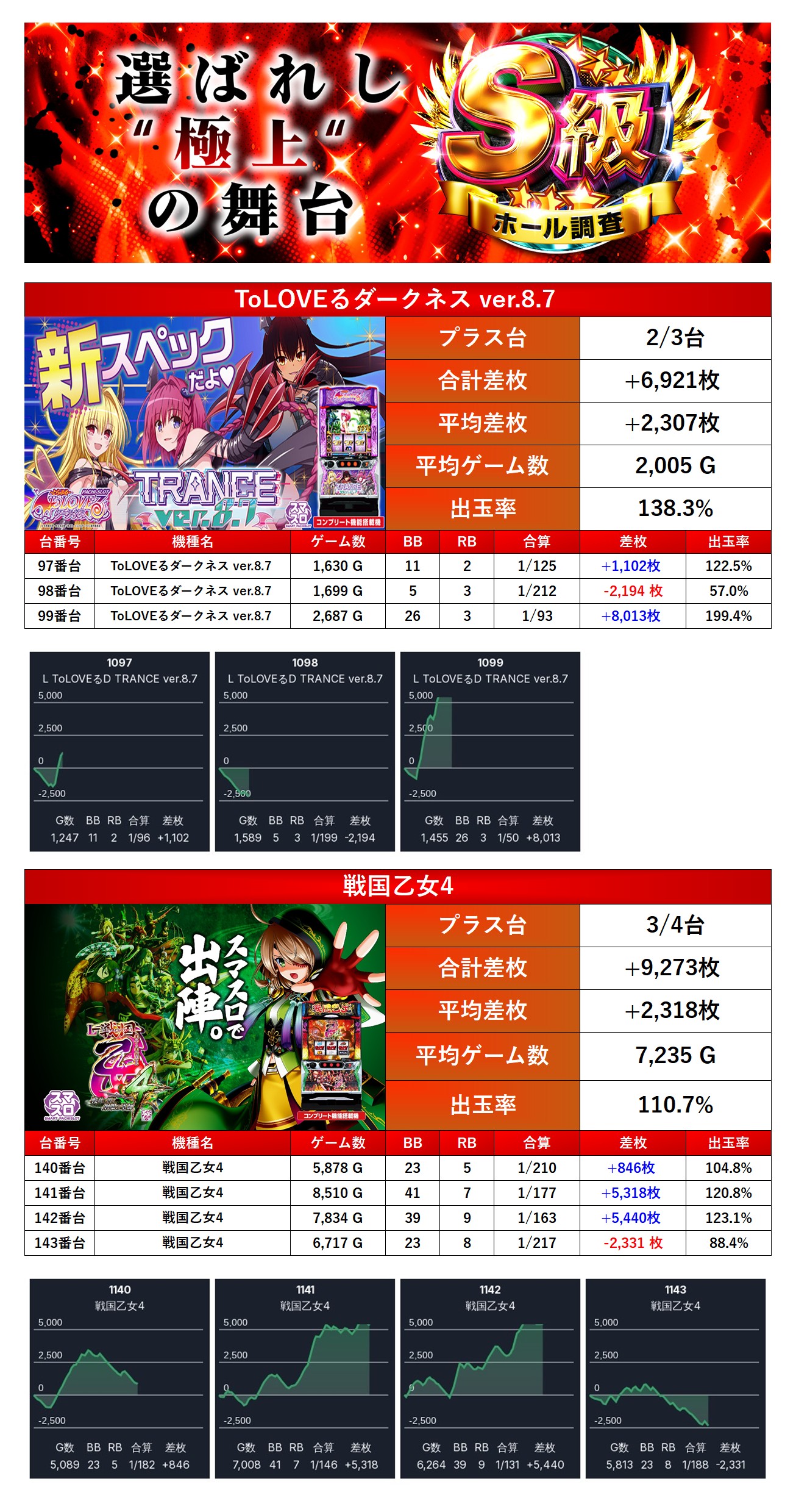 24回目となったS級‐赤‐は「全台が好調だった機種」の戦国乙女4がゲーム数・差枚共に素晴らしい結果だろう。「2台設置以下の台」の打ち込みも増え差枚がしっかりついてくるようになった。pick up率は15.1%となった。店内全体を見ても総差枚が+4,950枚と平均+30枚と安定した出玉が確保されており、3連続での三ツ星獲得となった。ユーザーが増えてくるとしっかり打ち込まれるpick up台も増えてくるので出玉感も変わってくるだろう。今後の調査にも期待が持てる結果だった。