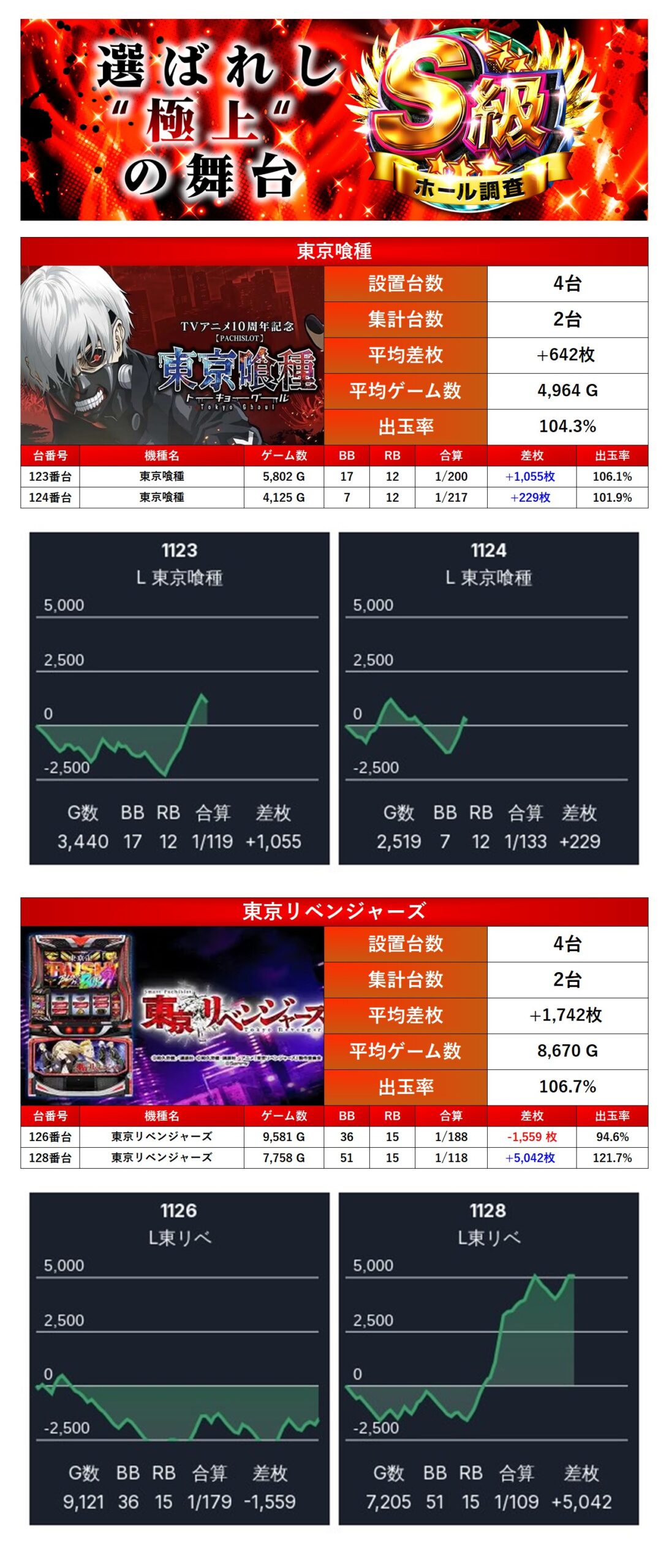 平均差枚+1,192枚、平均出率105.8%と少し控えめな結果となった。東京喰種は回転数が少なく、もっと打ち込まれていたなら展開はもっと変わっていたのかもしれない。