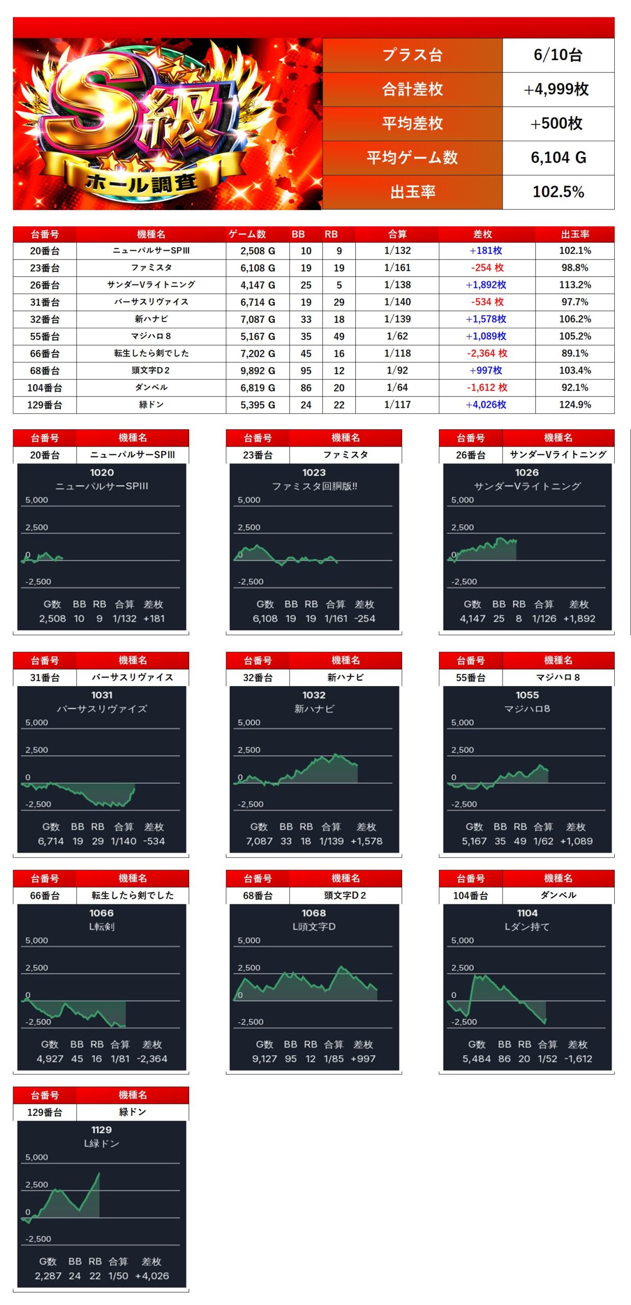 平均差枚+2,672枚、平均出率109.4%となった。どの台もしっかり粘られていて状況は良さそうだ。