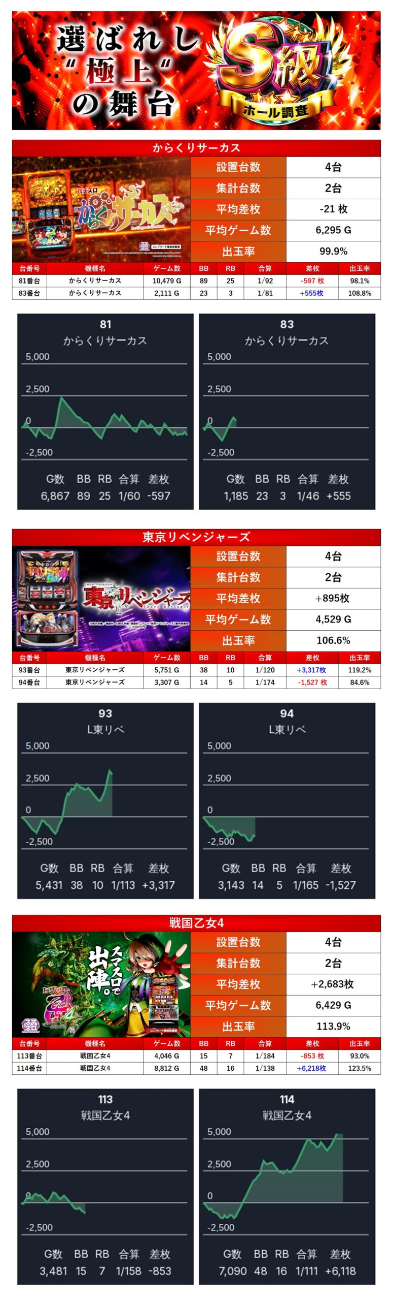 ニブイチは「からくりサーカス」「東京リベンジャーズ」「戦国乙女4」の3機種。平均差枚+1,186枚、出率106.9%と好成績を残した。