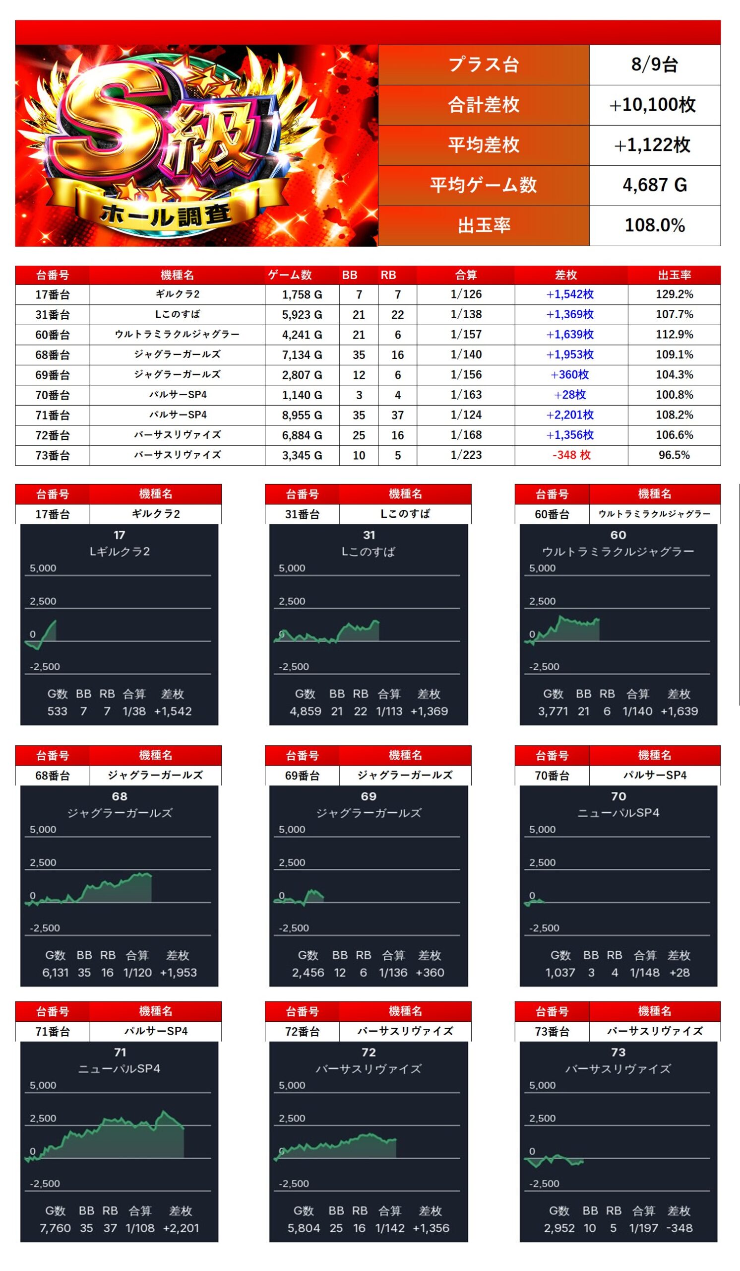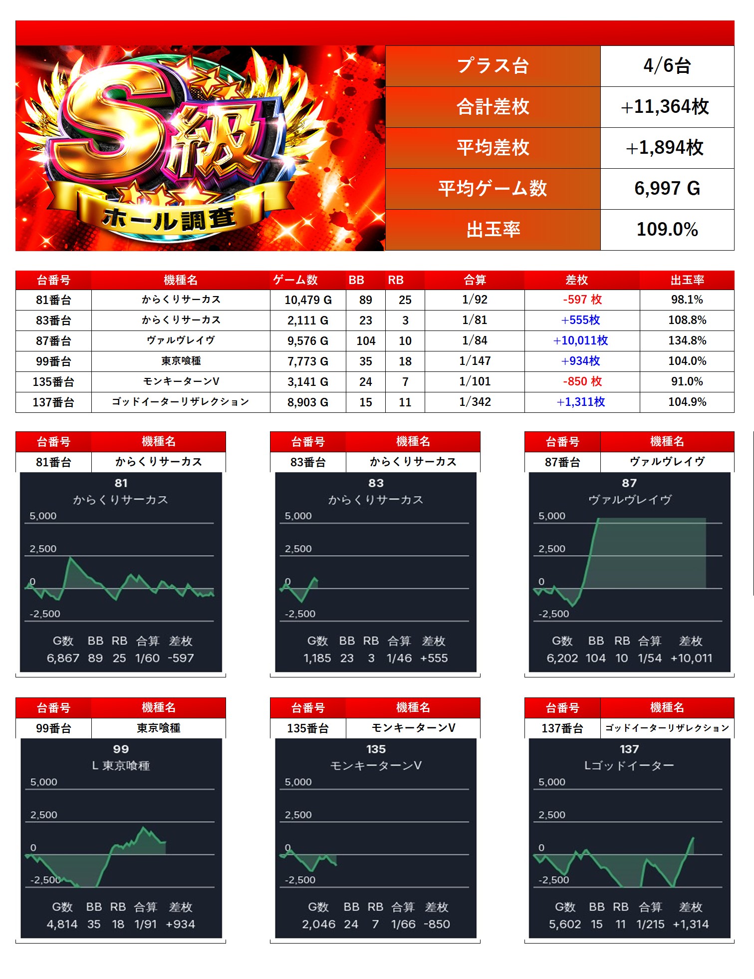 メイン優秀台からは6台をピックアップ。平均差枚+1,894枚、出率109.0%とメインらしい安定感を発揮し、プラス域をしっかり確保した。