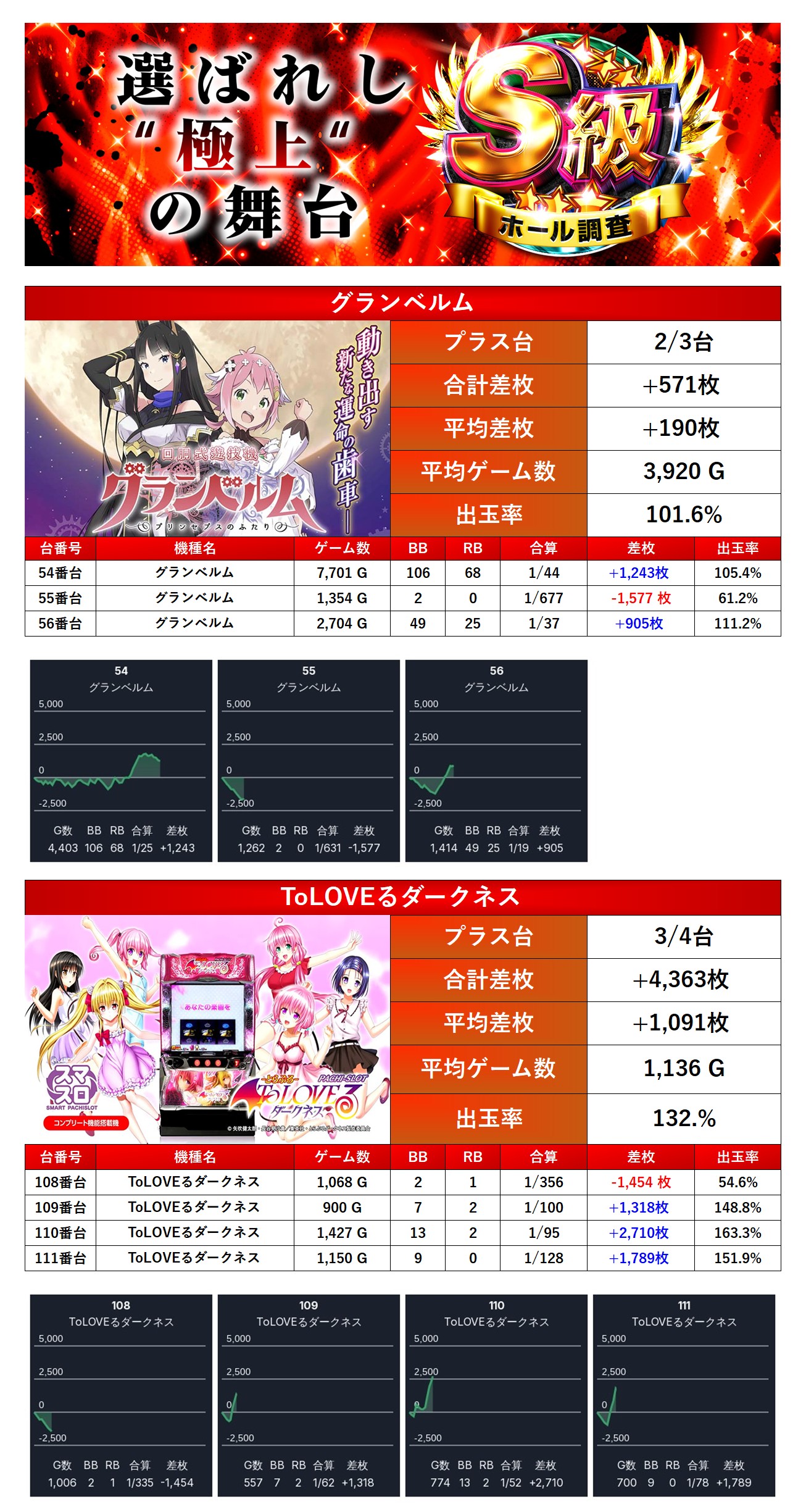 「グランベルム」と「ToLOVEるダークネス」の全台系は、平均差枚+705枚、出率110.1%。機種全体での盛り上がりをしっかり演出した結果となった。