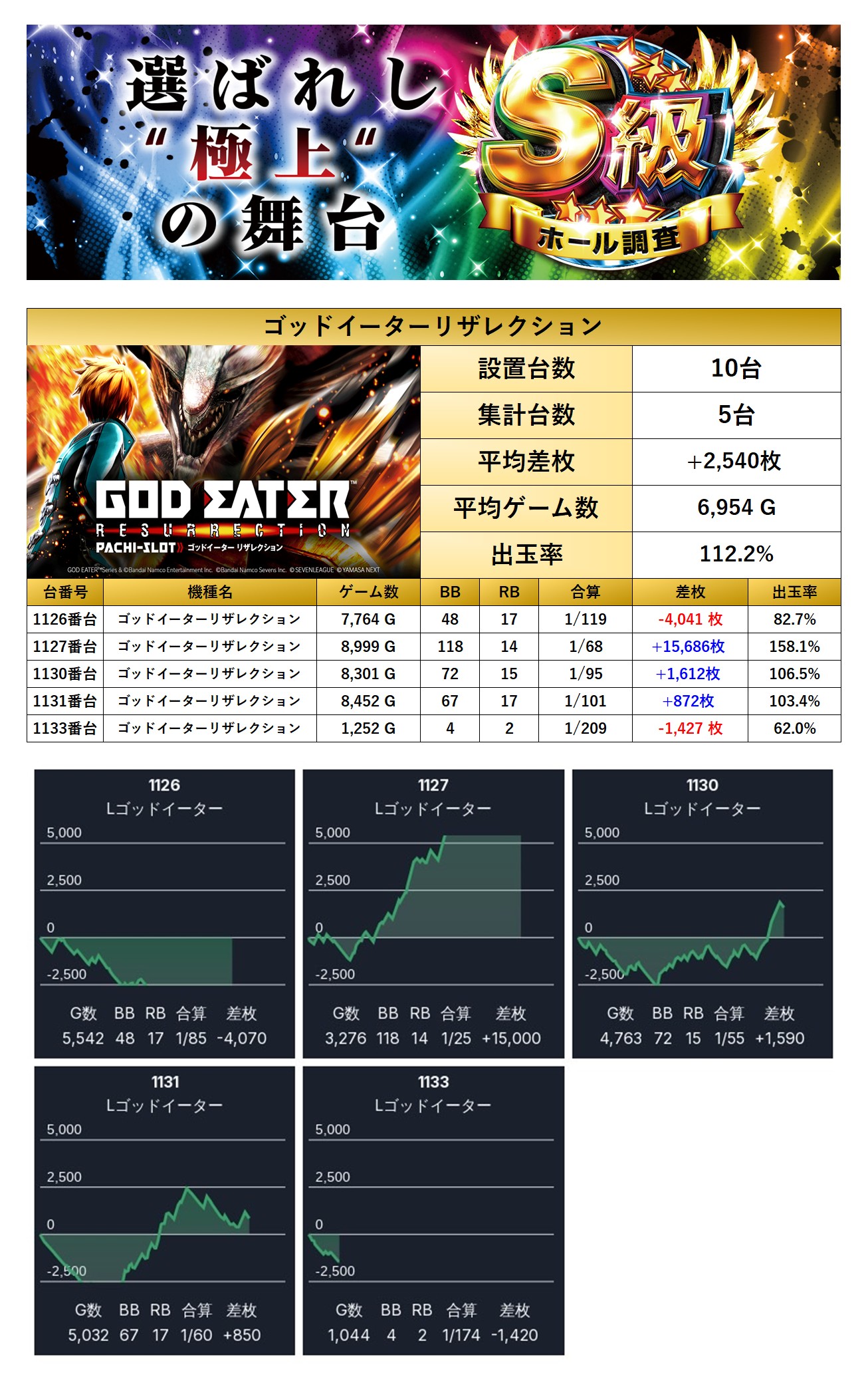 平均差枚は+3,179枚、平均出率114.4%と、圧巻の出率を誇った。ゴットイーターからは1.5万枚OVERが出ている。