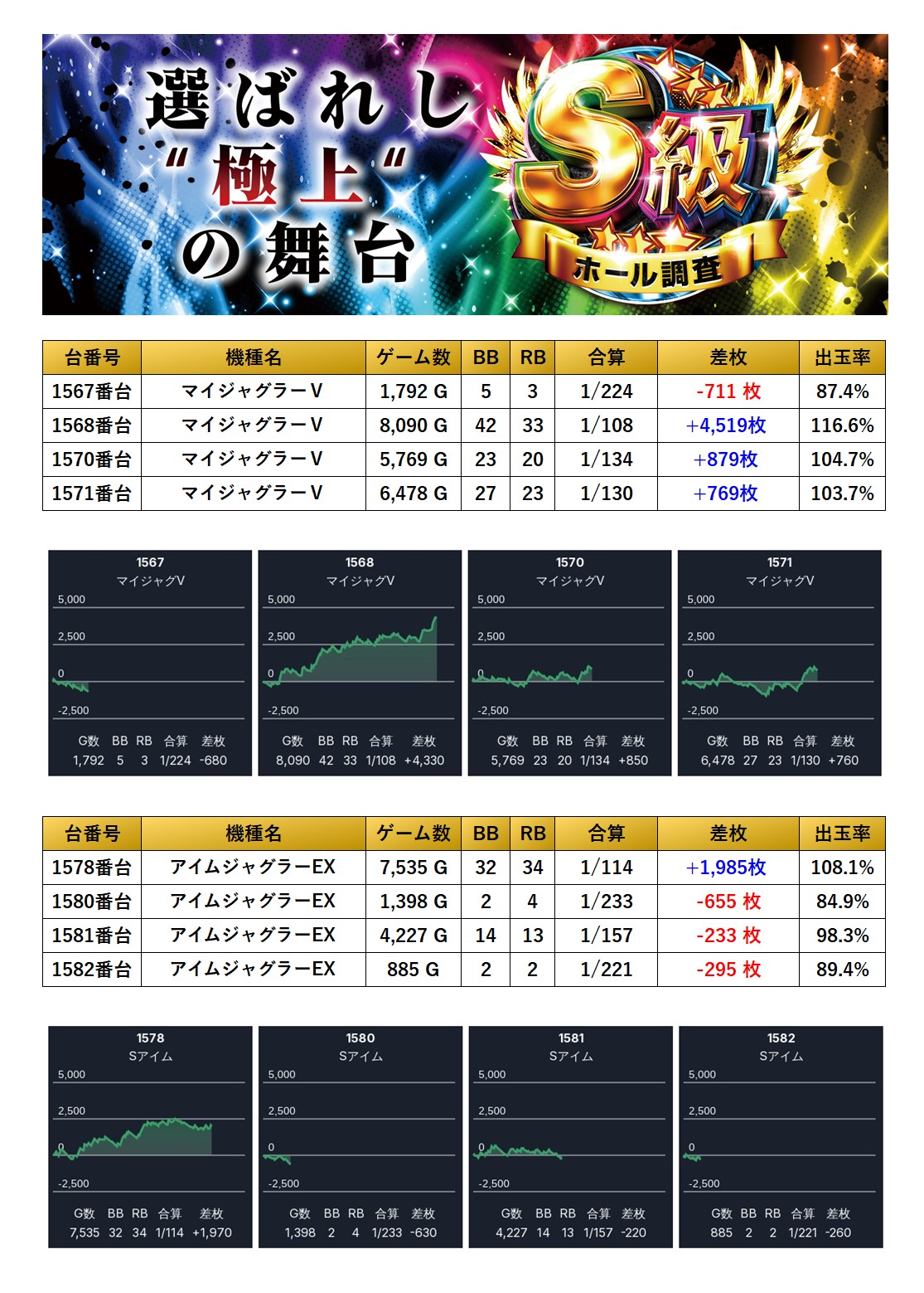 平均差枚は+3,191枚、平均出率111.3%と、こちらも素晴らしい出玉感が確認する事が出来た。