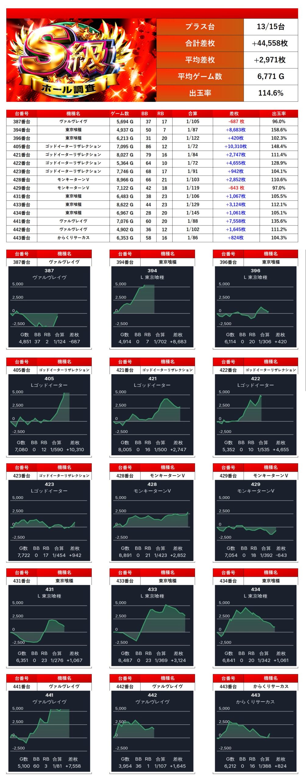 合計15台の平均差枚は +2,971枚、平均出率は 114.6% と文句なしの好成績を収めた。