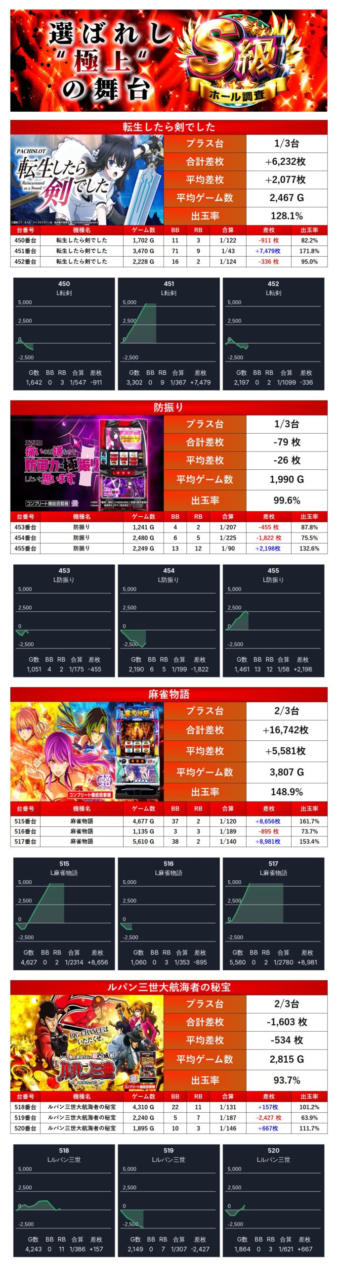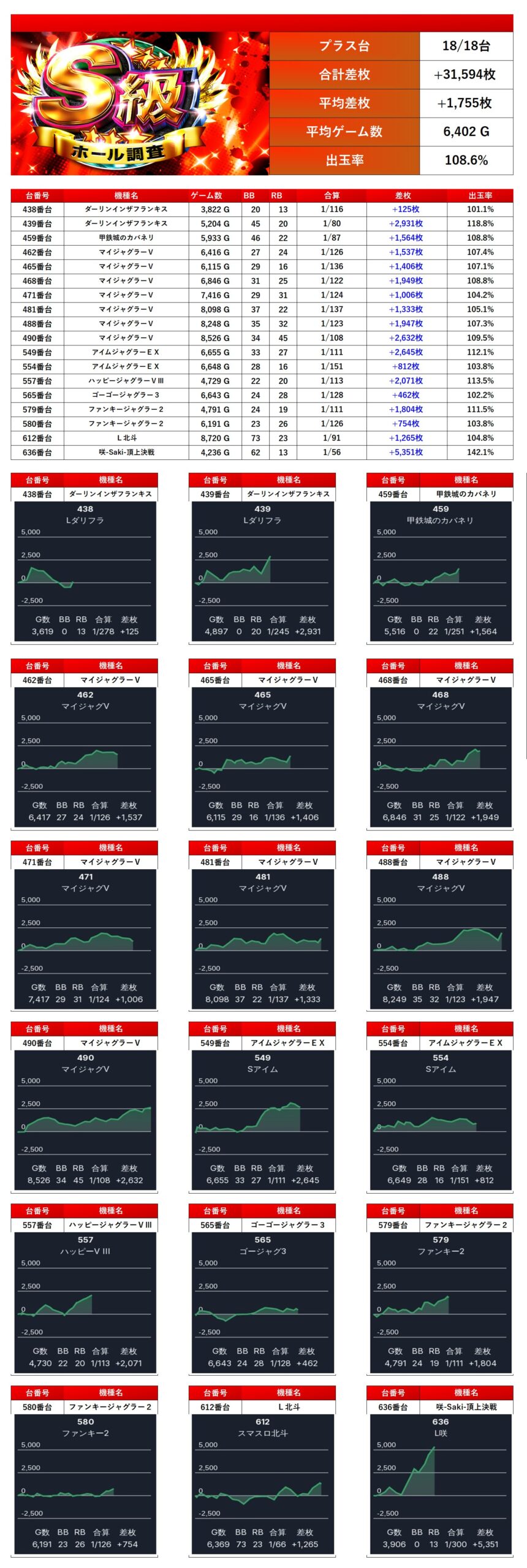 24回目となったS級調査-赤-も抽選65名という穴場感に満ちあふれている環境にも関わらず、pickup率18.1%超えと圧倒的な仕掛け量を誇った。